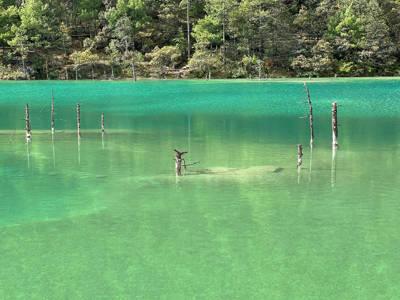 One of the lake’s most astonishing features is the sight of pine trees seemingly growing directly out of the water. These resilient conifers have taken root along submerged ridges or former shorelines, their trunks partially submerged yet thriving—an unusual ecological adaptation that adds to the site’s mystique. This rare phenomenon draws both botanists and casual observers, offering a striking visual contrast between the vibrant green foliage and the electric-blue water.