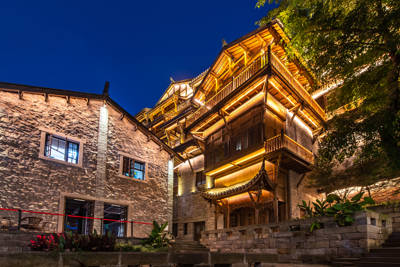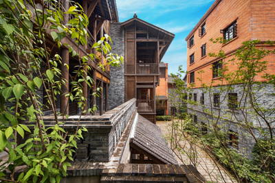 The **Traditional Culture Experience Zone (A & B Blocks)** immerses guests in Ba-Yu folk traditions, historic alleyways, and restored courtyard houses. Here, you’ll find非遗 (intangible cultural heritage) demonstrations like Sichuan embroidery, paper-cutting, and traditional opera masks, alongside authentic eateries serving Chongqing hotpot, Jianghu cuisine (rustic “rivers-and-lakes” dishes), and street snacks such as spicy skewers and glutinous rice balls. The architecture—featuring gray-tiled roofs, wooden lattices, and stone-paved lanes—evokes early 20th-century Chongqing while housing modern cafés and boutique guesthouses.