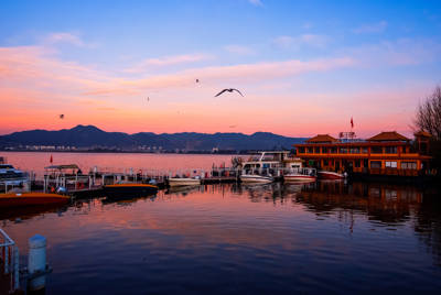 As your boat glides across the tranquil surface of Dianchi, you’ll be treated to panoramic vistas that showcase the region’s unique geography. To the west, the majestic Western Hills (Xishan) rise dramatically from the shoreline, their forested slopes crowned by ancient temples and the famed Dragon Gate (Longmen) grottoes carved into limestone cliffs. On clear days, the silhouette of the Sleeping Beauty Mountain—a natural rock formation said to resemble a reclining woman—adds a poetic touch to the landscape. Along the eastern shore, Haigeng Park unfolds with its century-old eucalyptus groves, the picturesque Seaview Promenade, and glimpses of the aerial cableway that connects to the Western Hills.