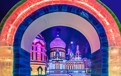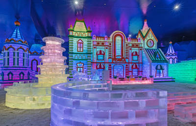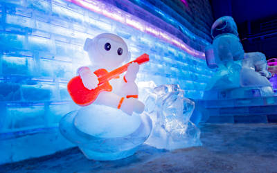 Another highlight is the Crystal Underwater Kingdom, where marine life—from dolphins and whales to coral reefs and schools of fish—is recreated entirely in translucent ice. Walking through this frozen ocean feels like diving beneath Arctic waters, with shimmering light effects mimicking sunlight filtering through sea ice.