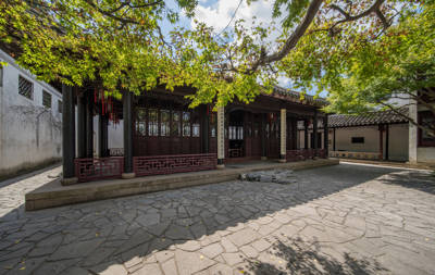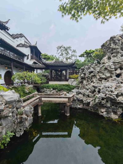 The garden’s few structures are strategically placed to enhance contemplation rather than dominate the scene. Behind the main mountain stands the charming “Ban Tan Qiu Shui Yi Fang Shan” pavilion (“Half-Pond Autumn Water, One Room Mountain”), named after a Tang dynasty poetic phrase describing serene reflections of green rapids and clear pools. From this vantage point, the rock formations appear like ink-wash paintings against the sky. A stone stairway leads northward to the “Bu Qiu Fang” (Autumn-Replenishing Boat House), a three-bay waterside hall that mirrors the southern reception hall across the pond—creating a classic Suzhou garden symmetry. Throughout the grounds, gnarled old trees, mossy stones, and carefully pruned shrubs deepen the sense of ageless tranquility.