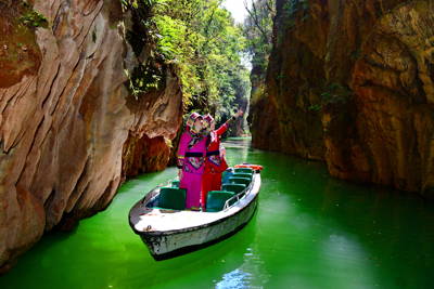 Your adventure begins with a dramatic 53-meter descent via a glass-fronted panoramic elevator down to Yin Cui Gorge (Yin Cui Xia), where you’ll board a small boat for a tranquil cruise through a narrow canyon flanked by sheer cliffs and dripping calcite formations. As sunlight filters through the gorge, the reflections on the water create an ethereal atmosphere.