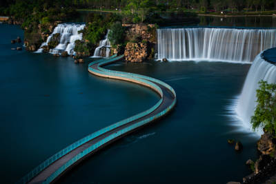 The park covers over 40 hectares and is divided into several thematic zones: the main waterfall viewing area, lakeside promenades, ecological wetlands, children’s play areas, and landscaped gardens filled with native Yunnan flora. The centerpiece—the 400-meter-wide waterfall—creates a thunderous yet soothing soundscape, visible and audible from multiple vantage points throughout the park. Walkways and observation decks allow visitors to experience the misty spray up close or admire panoramic views from elevated platforms. Downstream, the water flows into a series of tranquil lakes surrounded by willow trees, lotus ponds, and shaded benches, offering peaceful respites ideal for relaxation or photography.