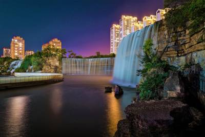 Kunming Waterfall Park, nestled in the bustling Panlong District of Kunming, Yunnan Province, is a remarkable urban oasis that seamlessly merges modern hydraulic engineering with scenic beauty. Often hailed as one of Kunming’s most photogenic and serene green spaces, the park centers around an awe-inspiring artificial waterfall—widely recognized as one of the broadest and most voluminous man-made waterfalls in China. Spanning approximately 400 meters in width and cascading down a 12.5-meter drop, the waterfall is not only a visual spectacle but also a functional component of the Niulan River–Dianchi Lake Water Diversion Project, which plays a critical role in replenishing Kunming’s iconic Dianchi Lake.