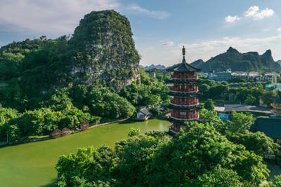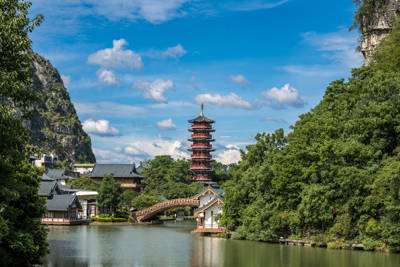 While Mulong Lake itself is a relatively recent addition to Guilin’s landscape—created during the late 1990s as part of the Two Rivers, Four Lakes restoration project—it draws deep inspiration from China’s imperial past. The entire area was meticulously designed based on the aesthetic and urban layout of the Song Dynasty masterpiece, "Along the River During the Qingming Festival" (Qingming Shanghe Tu). This iconic scroll painting depicts daily life in Bianjing (modern-day Kaifeng), the capital of the Northern Song Dynasty, and serves as the architectural blueprint for Mulong Lake’s pavilions, bridges, towers, and waterfront promenades. Visitors will notice sweeping eaves, vermilion pillars, and intricate wooden latticework reminiscent of Tang and Song dynastic grandeur.