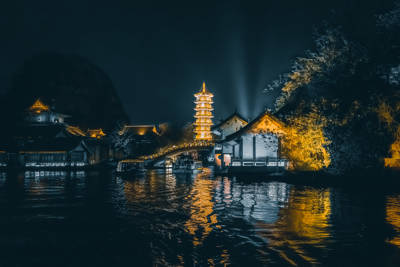 The scenic area masterfully integrates man-made elegance with Guilin’s legendary karst topography. The lake reflects the surrounding limestone peaks and lush greenery, while classical Chinese structures—such as the Nine-Dragon Bridge, Moonlight Pavilion, and Dragon Boat Dock—dot the shoreline. At night, the entire zone transforms into a shimmering spectacle: thousands of LED lights illuminate the water, bridges, and buildings, earning it comparisons to Venice and solidifying its reputation as one of Guilin’s most photogenic evening destinations. Boat tours along the interconnected waterways offer a tranquil perspective of this illuminated dreamscape.