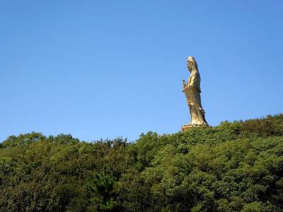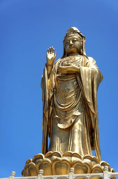 Rising gracefully against the East China Sea, the Nanhai Guanyin Statue is the most iconic symbol of Mount Putuo, one of China’s Four Sacred Buddhist Mountains. Standing at an impressive 33 meters (108 feet) tall—including an 18-meter bronze figure, a 2-meter lotus pedestal, and a 13-meter base—the statue dominates the southern coastline of the island. Cast entirely in bronze with the face gilded in 6.5 kilograms (13 jin) of pure gold, the statue glows softly under sunlight, radiating both grandeur and tranquility. From nearly every vantage point on Mount Putuo, visitors catch glimpses of this serene bodhisattva, making it a constant spiritual presence throughout the pilgrimage.