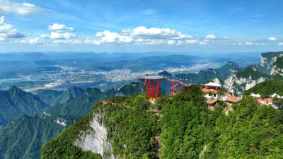 The undisputed highlight for most visitors is the “1520 Sky Eye”—a bold, crimson-red steel-framed glass observation platform jutting out over the cliff edge. Suspended at 1,520 meters above sea level (hence the name), this fully transparent deck delivers a heart-pounding 360-degree view of Zhangjiajie’s emerald canyons, winding rivers, and distant urban sprawl. On clear days, visibility stretches for dozens of kilometers, while misty mornings transform the landscape into a living Chinese ink painting. The contrast between the vibrant red structure and the natural backdrop makes it one of the most photographed spots in central China—and a magnet for social media travelers.