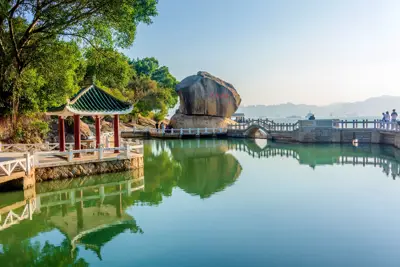 The centerpiece of Cang Hai Yuan is the iconic Forty-Four Bridge (Sishi Si Qiao), named after Lin Erjia’s age when he constructed it. This elegant stone bridge curves gracefully along the shoreline and features a tidal gate that allows seawater to flow into the garden, creating a dynamic interplay between inner ponds, outer pools, and the open sea. It remains one of the best vantage points on Gulangyu for watching sunsets or listening to waves crash against the rocks.
