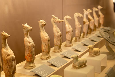 The museum’s collection spans multiple floors, each offering a distinct thematic experience. On the first floor, visitors encounter key artifacts such as the famed “Sea Beast and Grape Mirror”—a bronze mirror symbolizing cultural fusion between East and West—and vividly painted tomb guardian figures (zhenmushou), which reflect Tang beliefs about the afterlife. The third floor hosts the engaging “Hundred Crafts of the Silk Road” special exhibition, where live demonstrations bring ancient techniques to life: watch artisans craft silk, play traditional instruments like the ceramic ocarina (xun), practice calligraphy, or simulate Persian-style glassmaking. This hands-on zone doubles as a retail space, allowing guests to purchase authentic reproductions. The fourth floor’s “Selected Treasures” exhibition showcases rare pieces including a tri-color glazed figurine of a Central Asian musician and a stunning Northern Song dynasty celadon vase from Yaozhou Kiln, decorated with peony and daylily motifs.