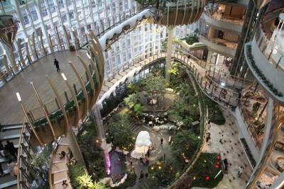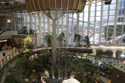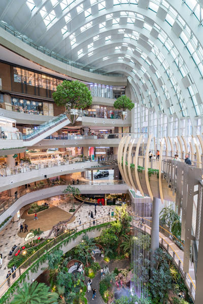 Designed by world-renowned landscape architects, the 'Forest Bathed in Light' features three major thematic zones: the iconic Life Tree, the ethereal Suspended Forest, and the dramatic Flower Cascade Valley. The centerpiece—a towering artificial tree wrapped in real vines and epiphytes—serves as both structural support and symbolic heart of the space. Around it, aerial walkways, glass-bottom bridges, and suspended plant pods create a multi-sensory journey through layers of greenery. The vertical layout cleverly uses natural light from a massive skylight above, supplemented by energy-efficient LED systems that mimic daylight cycles, ensuring optimal growth for tropical flora like bird-of-paradise, monstera deliciosa, ferns, orchids, and even small palms.