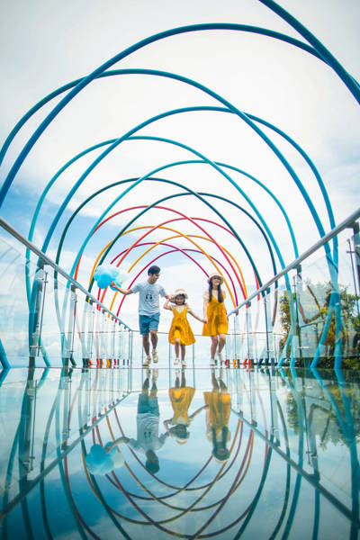 The All-Seaview Glass Skywalk perches at 450 meters above sea level, offering panoramic vistas that stretch from mountain peaks to the turquoise waters of Yalong Bay. Constructed with 130 tons of ultra-clear imported laminated glass, this 400-meter-long walkway includes themed segments like the Rainbow Path, Love Vows Terrace, and Heart-to-Heart Platform. Walking across feels like floating above the treetops — thrilling yet serene, with views extending over valleys, coastline, and cloud-draped ridges.
