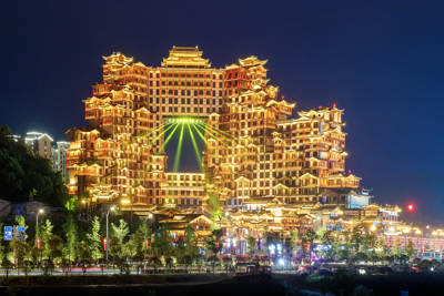 The project draws its name and spirit from the legendary “Ninety Bows, Eighteen Villages, and Seventy-Two Wondrous Towers” of the Wuling Mountains—a mythic reference deeply rooted in local Tujia and Miao ethnic folklore. At its heart stands the world’s tallest stilted building, certified by Guinness World Records at 109.9 meters (360 feet). This architectural feat pays homage to traditional Diaojiaolou (stilt houses) common among southwestern China’s ethnic minorities, reimagined with modern engineering and dramatic lighting for a truly awe-inspiring silhouette against the night sky.