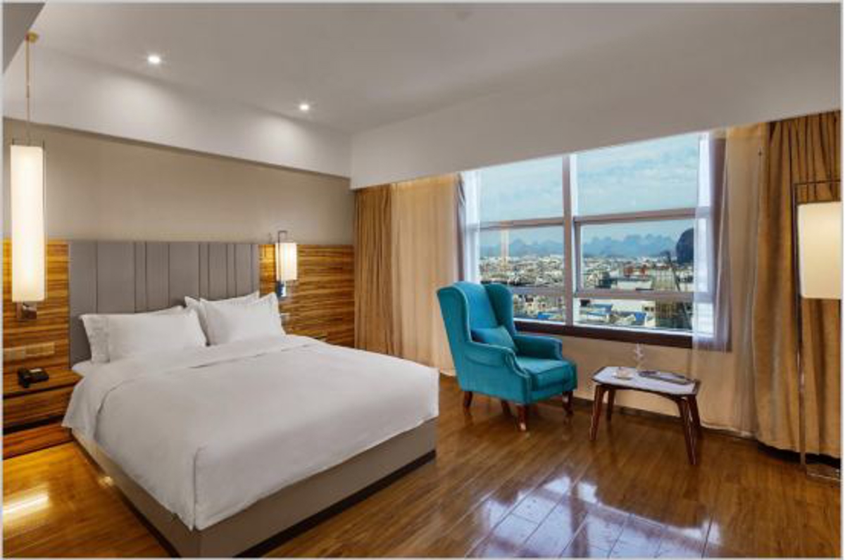 Why Stay Here: One of Guilin's top luxury hotels, located at No. 5 Shanhubei Road, Xifeng District. The location and environment are excellent—right next to Shan Lake in the Two Rivers and Four Lakes area, and within walking distance of Central Square, East-West Lane, and Wangcheng Scenic Area. The hotel features a cloud-top restaurant and starry sky lounge on the top floor, serving Guangxi creative cuisine in an elegant setting. After dinner, enjoy whiskey at the starry sky lounge while overlooking the Sun and Moon Twin Towers (日月双塔) lake view—a perfect retreat. The hotel offers 66 rooms including lake-view balcony suites, family rooms, and duplex rooms. Room rates: 600-800 RMB ($83-111 USD).