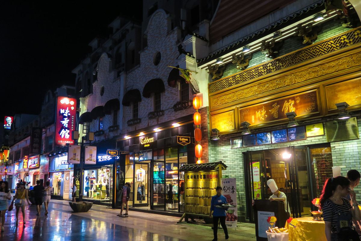 Cross Street (十字街) gets its name from the intersection of Zhongshan Road and Jiefang Road—Guilin's downtown core and busiest commercial district. Here you'll find every kind of food imaginable, and attractions like Taohua River, Rong Lake, and Elephant Trunk Mountain (象鼻山) are all within walking distance.