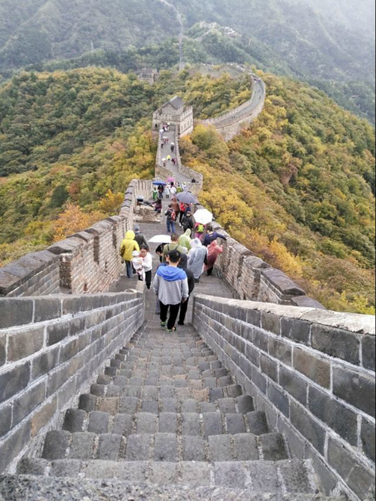 I arrived early and spent time taking photos. By the time I was done, more people started arriving. It was quite cold that day, with light drizzling—it is National Day, after all. On the Great Wall, people had umbrellas, some wore raincoats, some wrapped themselves in thick clothes. By 9 AM, there were already so many people that you couldn't get a shot without heads in it.