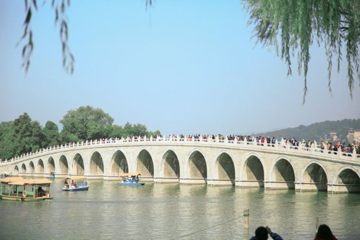 The Seventeen-Arch Bridge (十七孔桥), a must-see for tour groups. When we arrived at Summer Palace (颐和园), there was almost no one. By the time we did a full loop and came back, it was around 9:30 AM—already a sea of people. The photo below is what we took when we came back. The bridge is full of people.