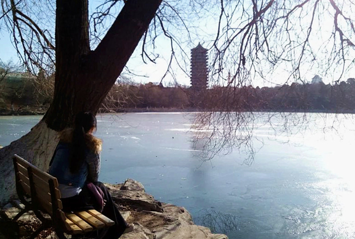 A 15-minute walk east brings us to PKU, China's oldest modern university and arguably its most prestigious. The campus centers on Weiming Lake (未名湖)—the "Nameless Lake"—which freezes solid in winter. Students skate here while the Boya Pagoda (博雅塔) looms overhead like a sentinel.