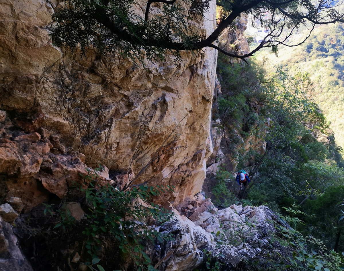 The "trail" to the wall is actually a near-vertical rock face. We're not hiking—we're climbing. Hand over hand, finding footholds in crumbling earth, wondering if this is how it ends: a foreign news headline about tourists who fell off a mountain in China. My friend Fengjie and I take turns scouting ahead, calling back safe routes like we're summiting Everest (we're not—we're just out of shape).