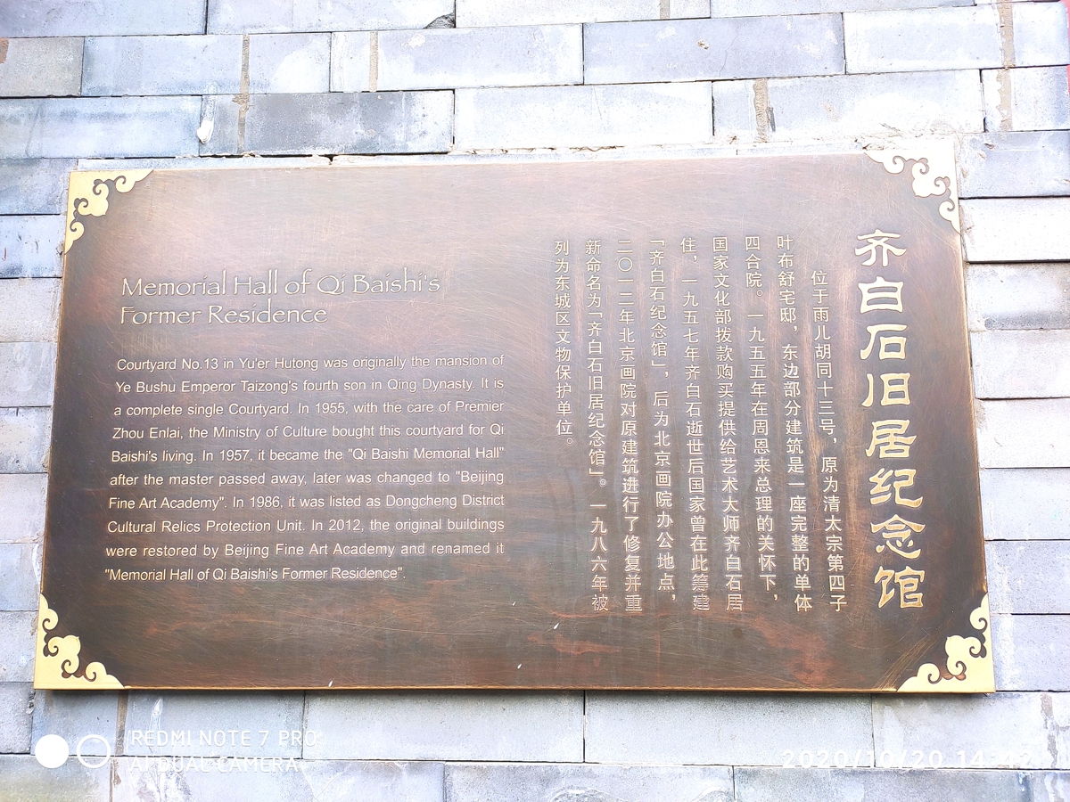 Hutong No. 13 in Yu'er Hutong (雨儿胡同13号) is the Qi Baishi (齐白石) Former Residence Memorial Hall.