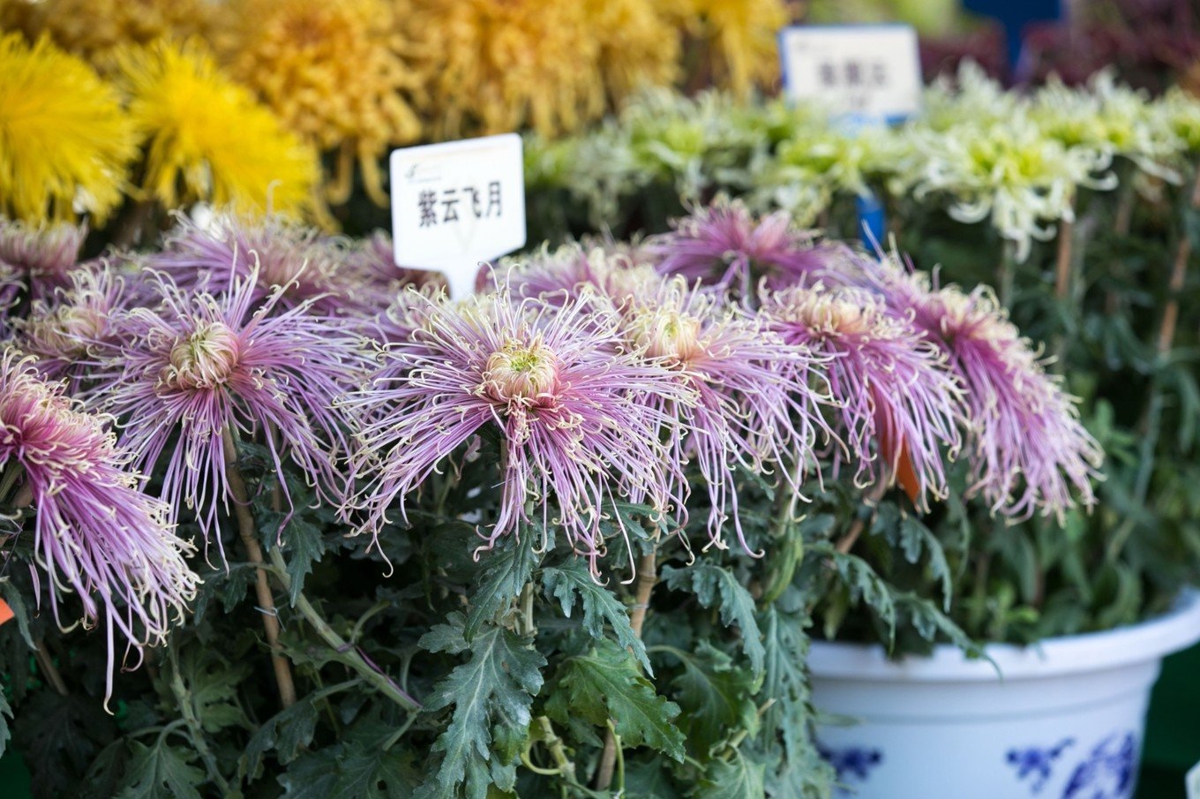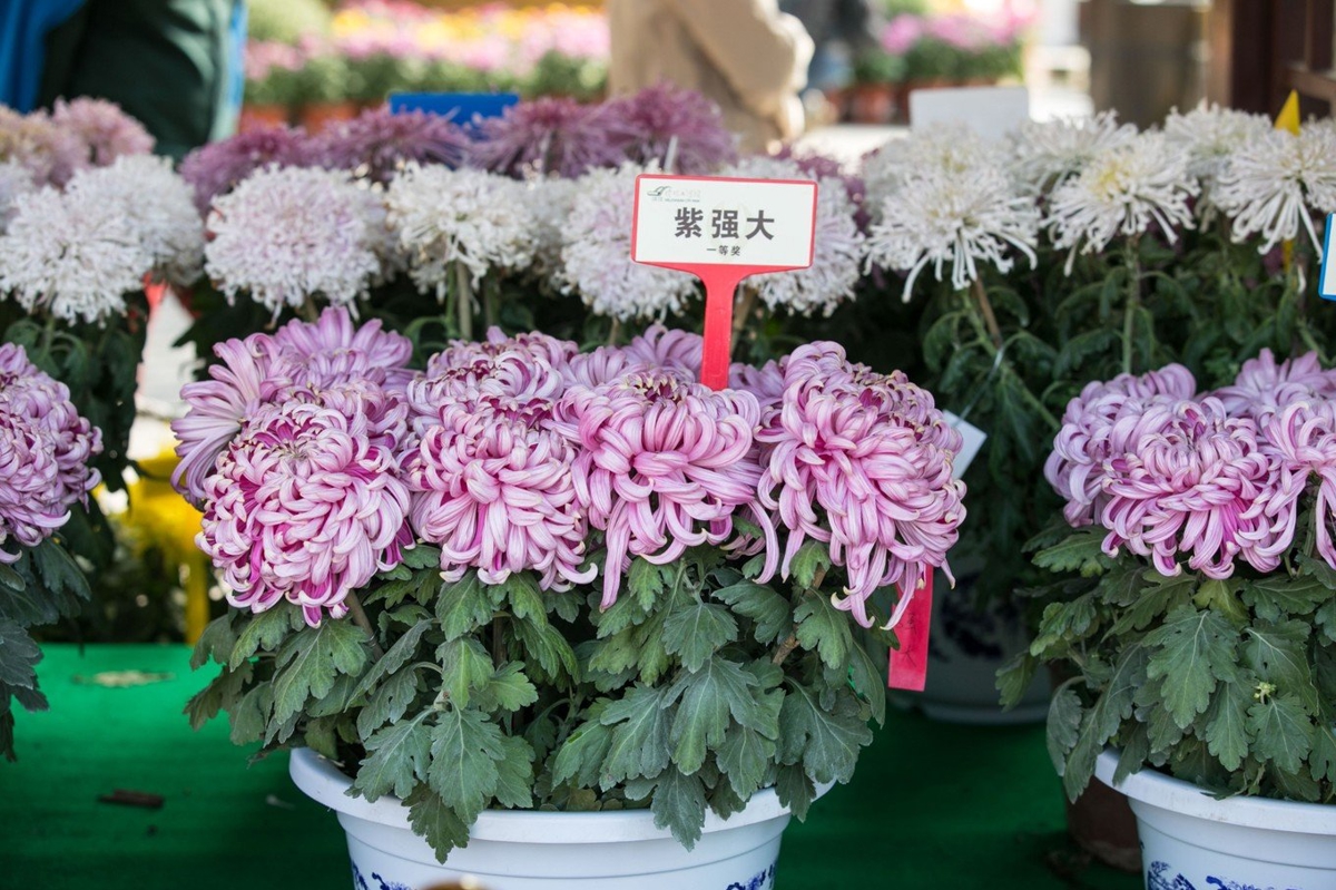 Chrysanthemum viewing was a key part of our Kaifeng trip. Here you'll find every chrysanthemum variety you can imagine—and some you can't. Names like "Purple Strong" (紫强大), "Purple Cloud Flying Moon" (紫云飞月), "Yellow Yue Mountain" (黄越山), "Six Buddha Warriors" (六刹金刚)—do these names sound imposing? Looking at the flowers, you can see they're equally remarkable. These are top-tier quality chrysanthemum varieties. What a privilege to see such rare specimens at Qing Yuan!