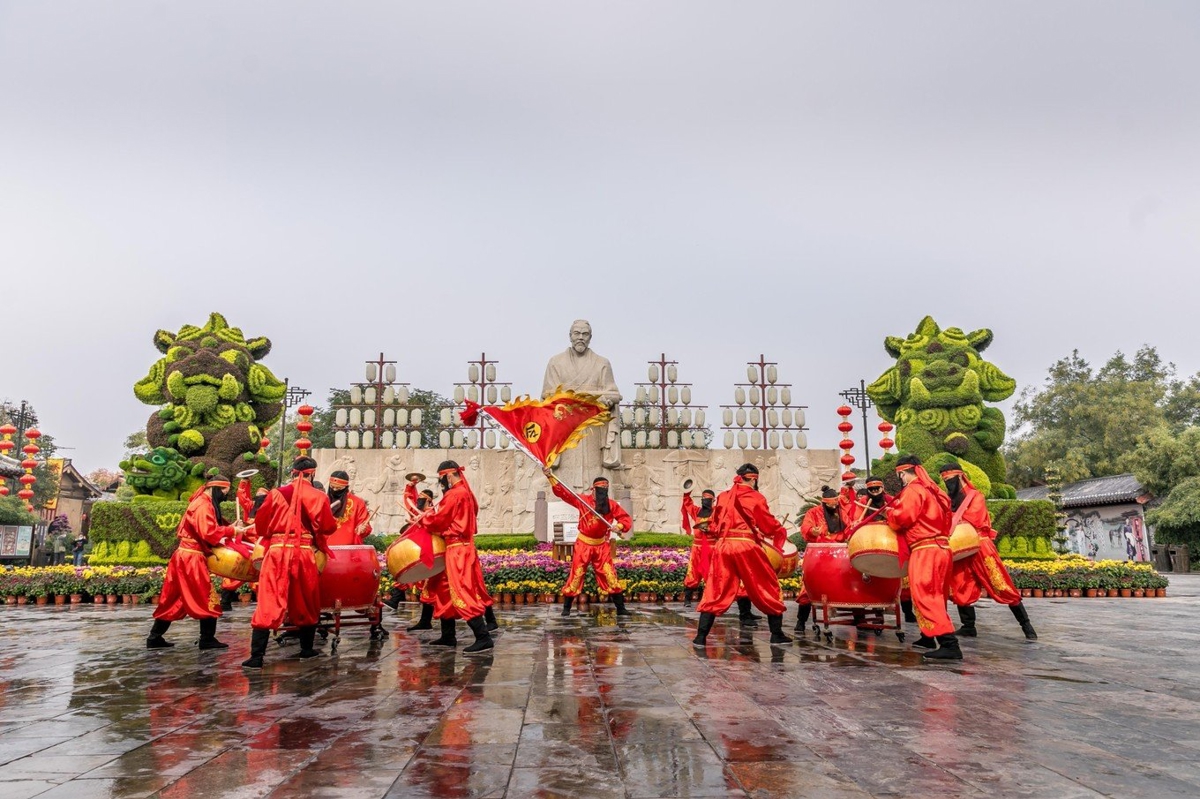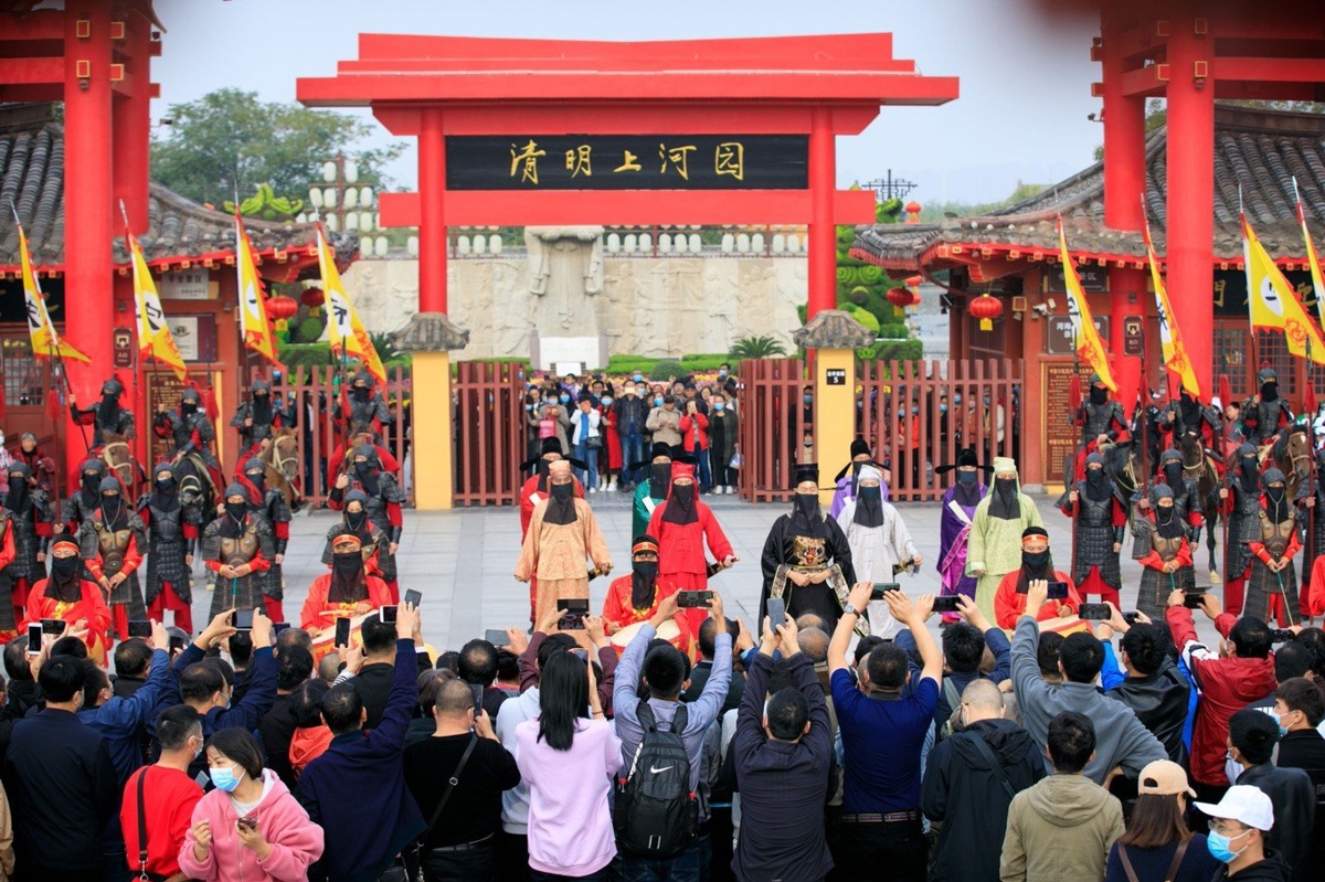 After witnessing the grand opening ceremony, we followed the welcoming procession into Qingming Shanghe Garden (清明上河园). Entering the park, the first thing that catches your eye is the massive清明上河图carving and a statue of Zhang Zeduan. This breathtaking sculpture draws crowds of visitors eager for photos.