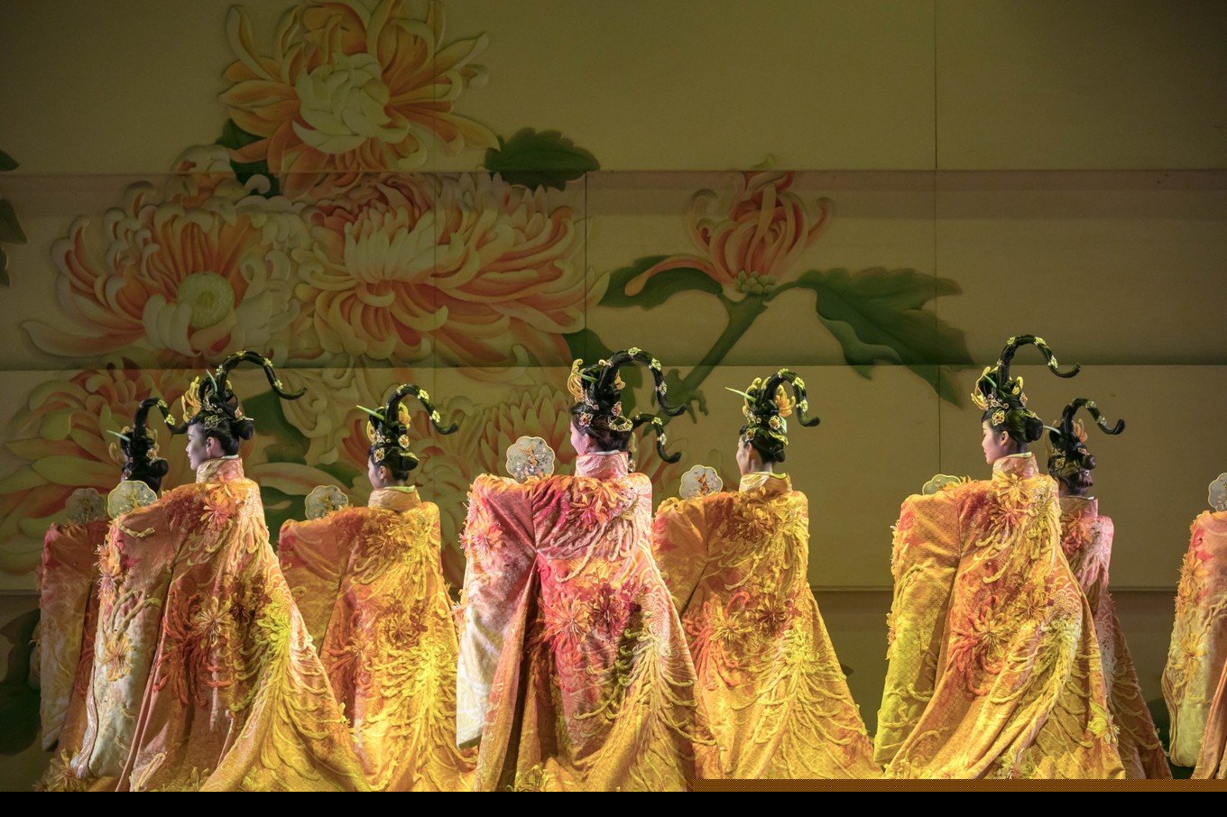 A few minutes later, several "Chrysanthemum Beauties" in elaborate costumes appear at the front of the stage. The audience erupts in warm applause. They're genuinely beautiful! This applause might be for their beauty, but also for the chrysanthemums and their spirit—blooming despite frost, unafraid of cold!
