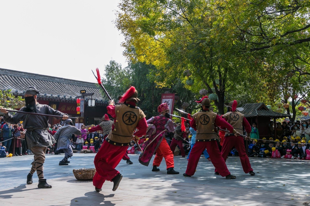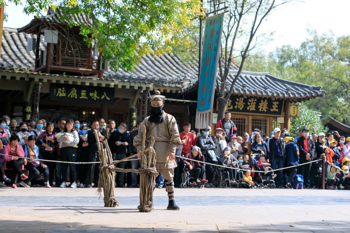 At 9 AM, the park's opening ceremony begins with genuine fanfare—horse-drawn carriages, drums pounding, and Judge Bao Zheng (包拯) leading his guards Wang Chao (王朝), Ma Han (马汉), Zhang Long (张龙), and Zhao Hu (赵虎) to welcome tourists from across the country.