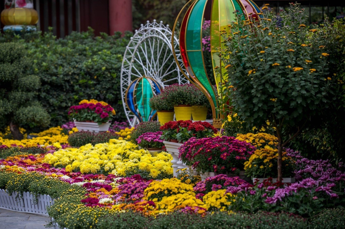 Magnificent lanterns cast the chrysanthemums in a more ethereal, colorful glow,惊艳了整个夜晚. A traveling companion becomes completely captivated by this spectacular sight, dancing before the flowers under the lanterns—truly romantic, leaving everyone mesmerized!