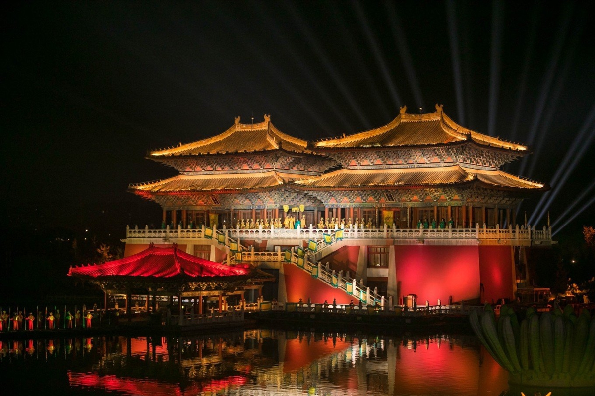 Walking to Qingming Cultural Square, I see it packed with tourists. They're preparing to stage the chrysanthemum-themed show "Beauty of Chrysanthemums" (菊美人)—a must-see during night tours, worth stopping to watch!