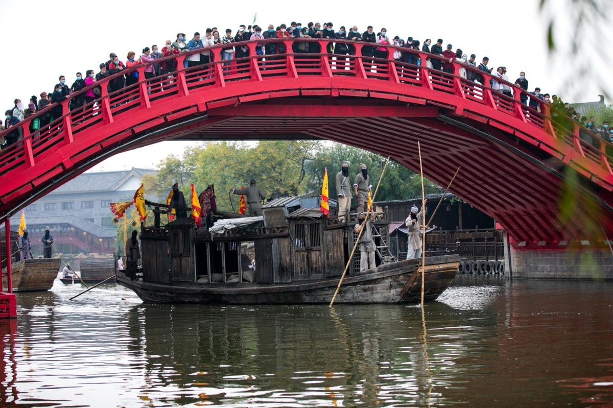 Crossing the Rainbow Bridge (虹桥), we watch the rippling waters. Walking through the streets, vendors in various ancient costumes hawk their wares.