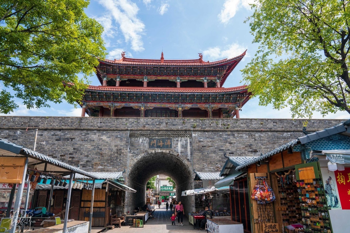 Dali has four city gates—east, west, south, and north. From our guesthouse, we passed by Erhai Gate (洱海门). The ancient town wall's outer face is brick-built, and the gate tower's roof is the higher-grade double-eaved Xieshan style found in Chinese palace architecture. Actually, the oldest preserved buildings in Dali might be just over a century old—due to historical reasons, they suffered varying degrees of destruction in different periods. Buildings that survived the long journey are few; most were rebuilt and renovated according to the original appearance.