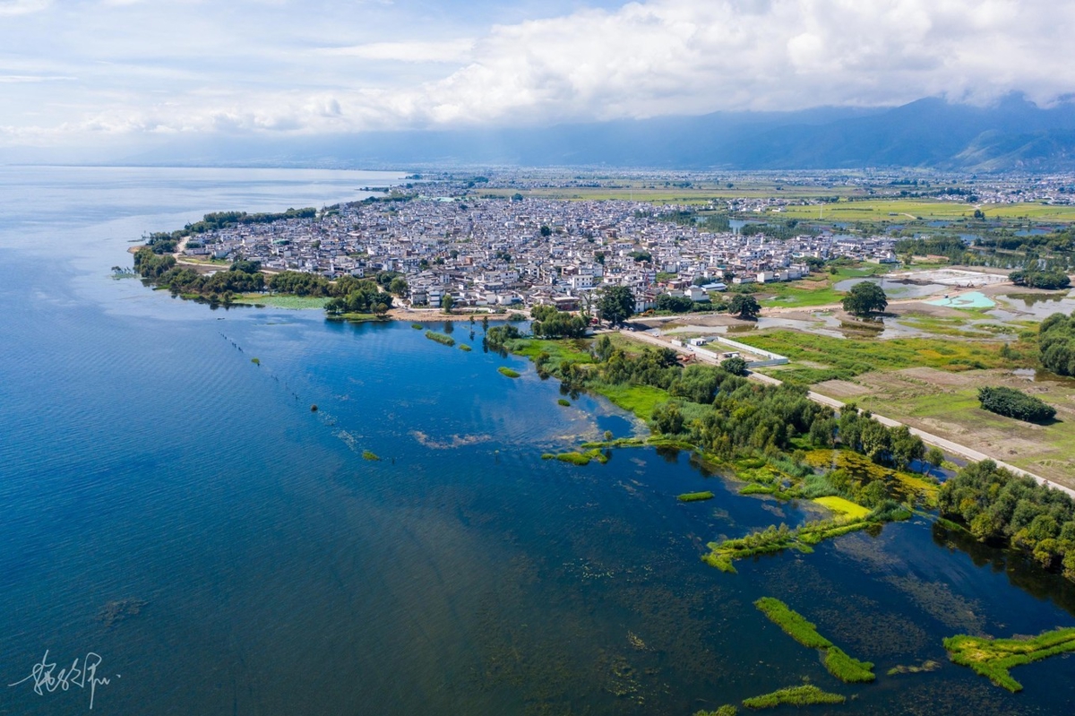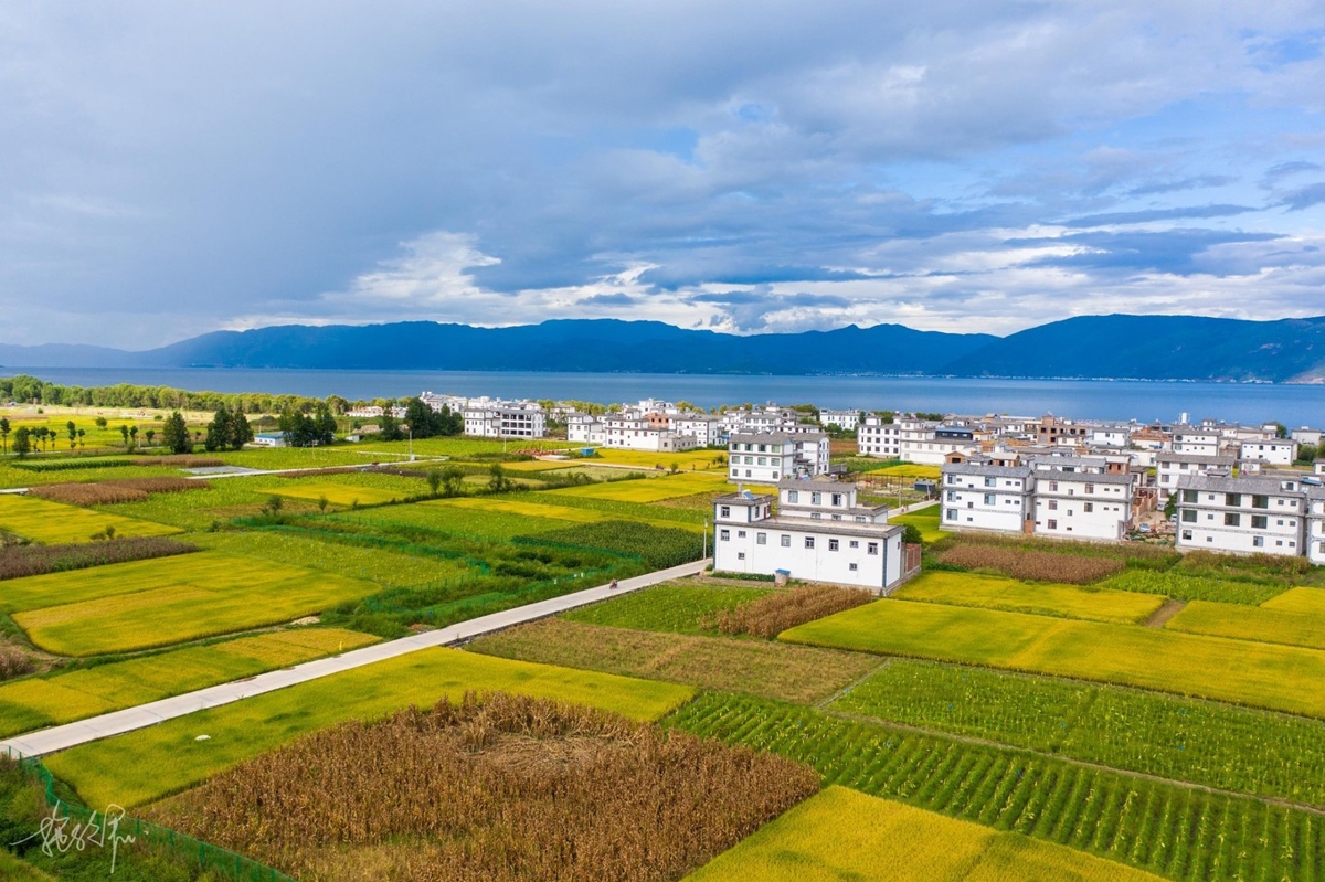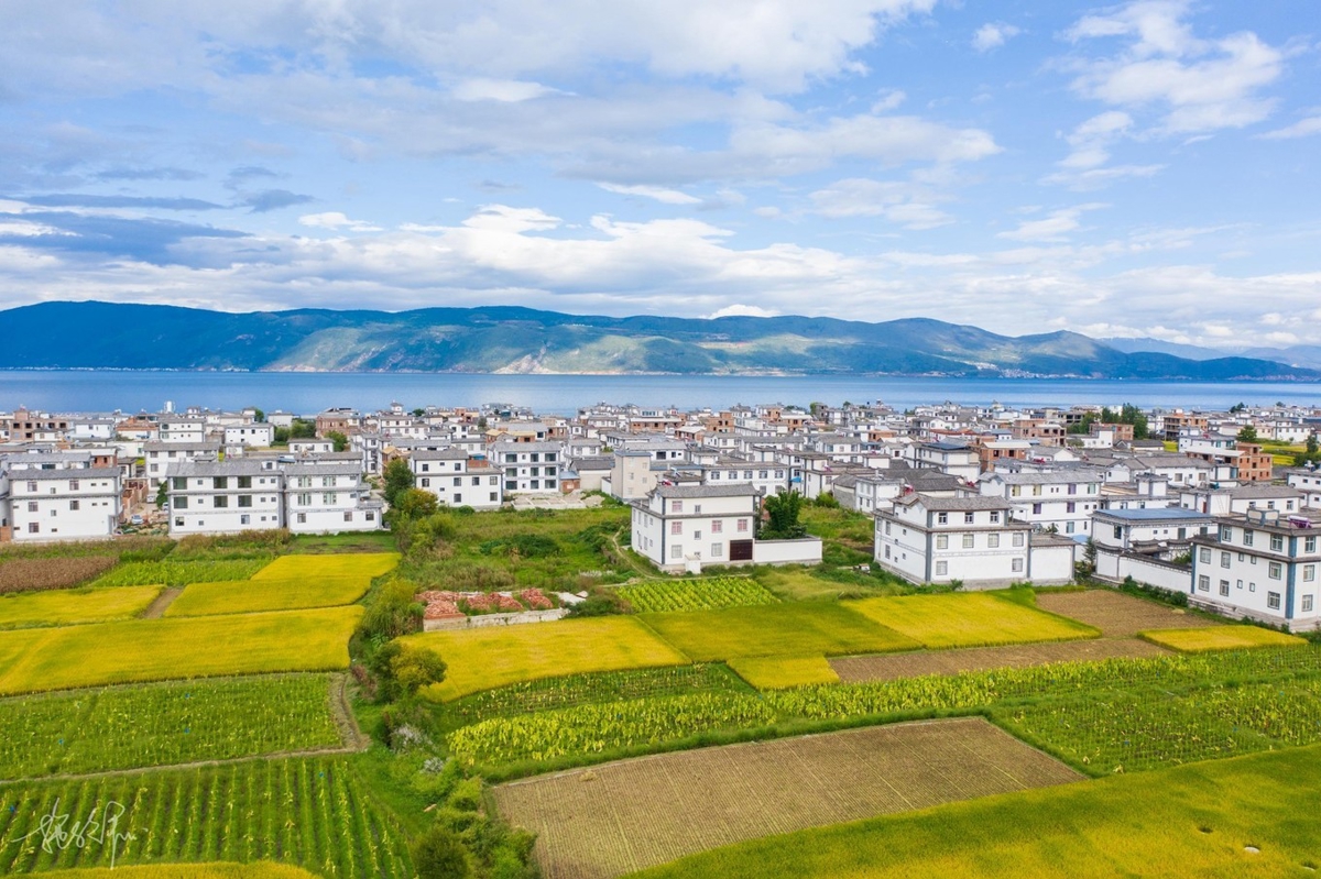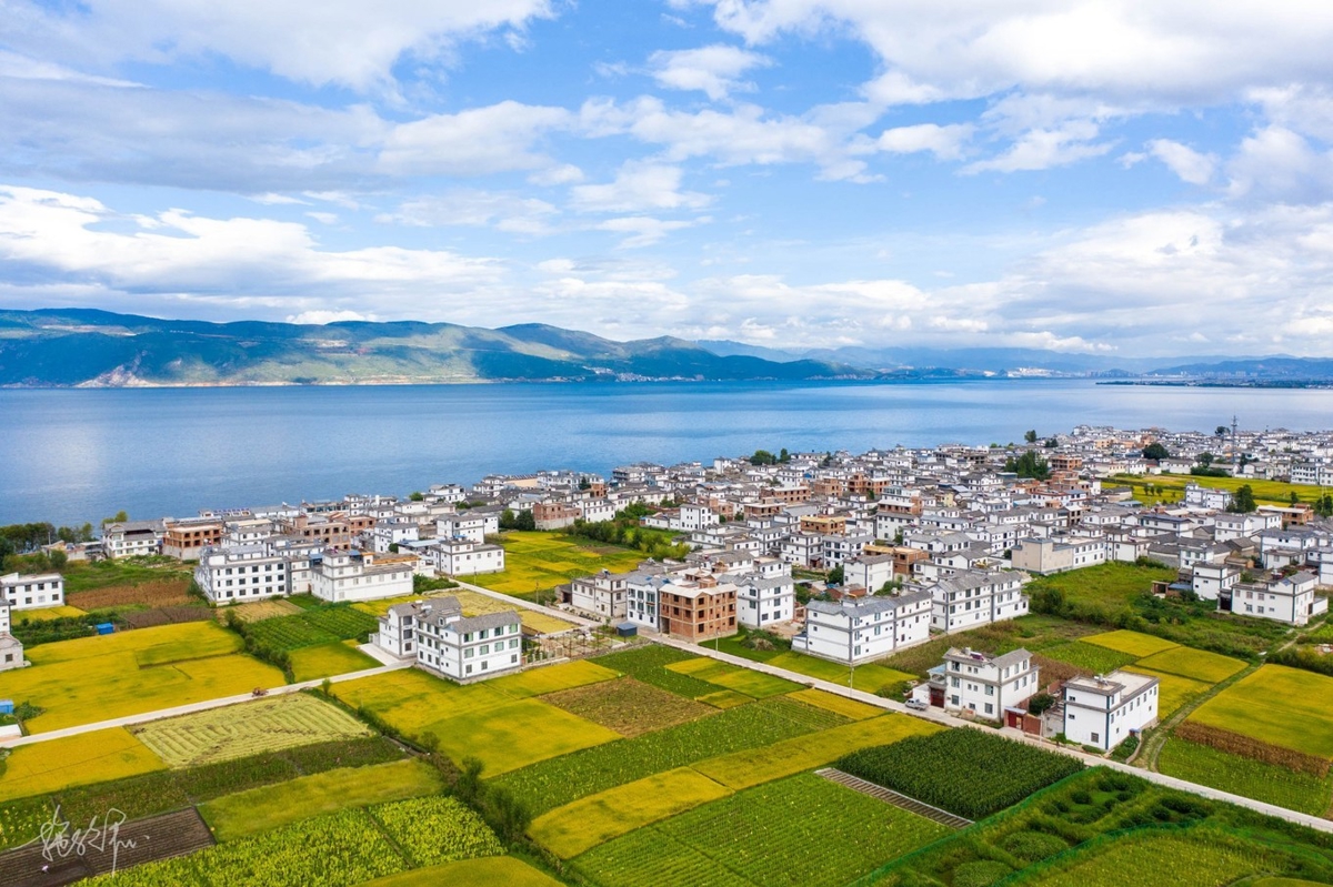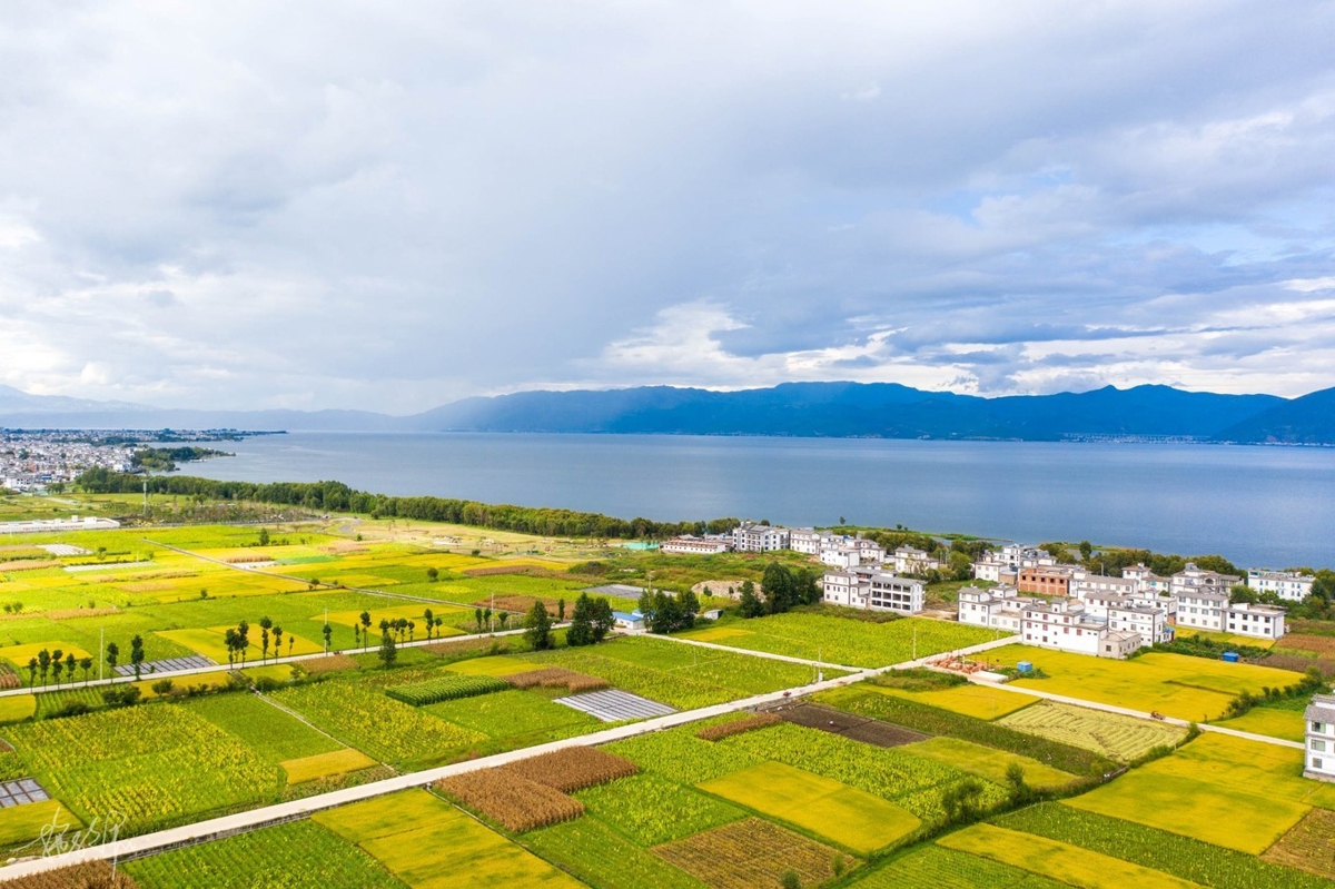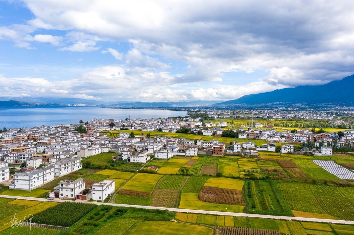 My drone took me through the wheat fields, over houses, toward Erhai Lake. The weather had become clearer since morning, and my mood improved with it. It's quite joyful traveling with people who all like photography—no one needs to wait for anyone. Everyone knows when shooting is done, they'll call a stop. When not done, everyone does their own thing. I love this feeling most.