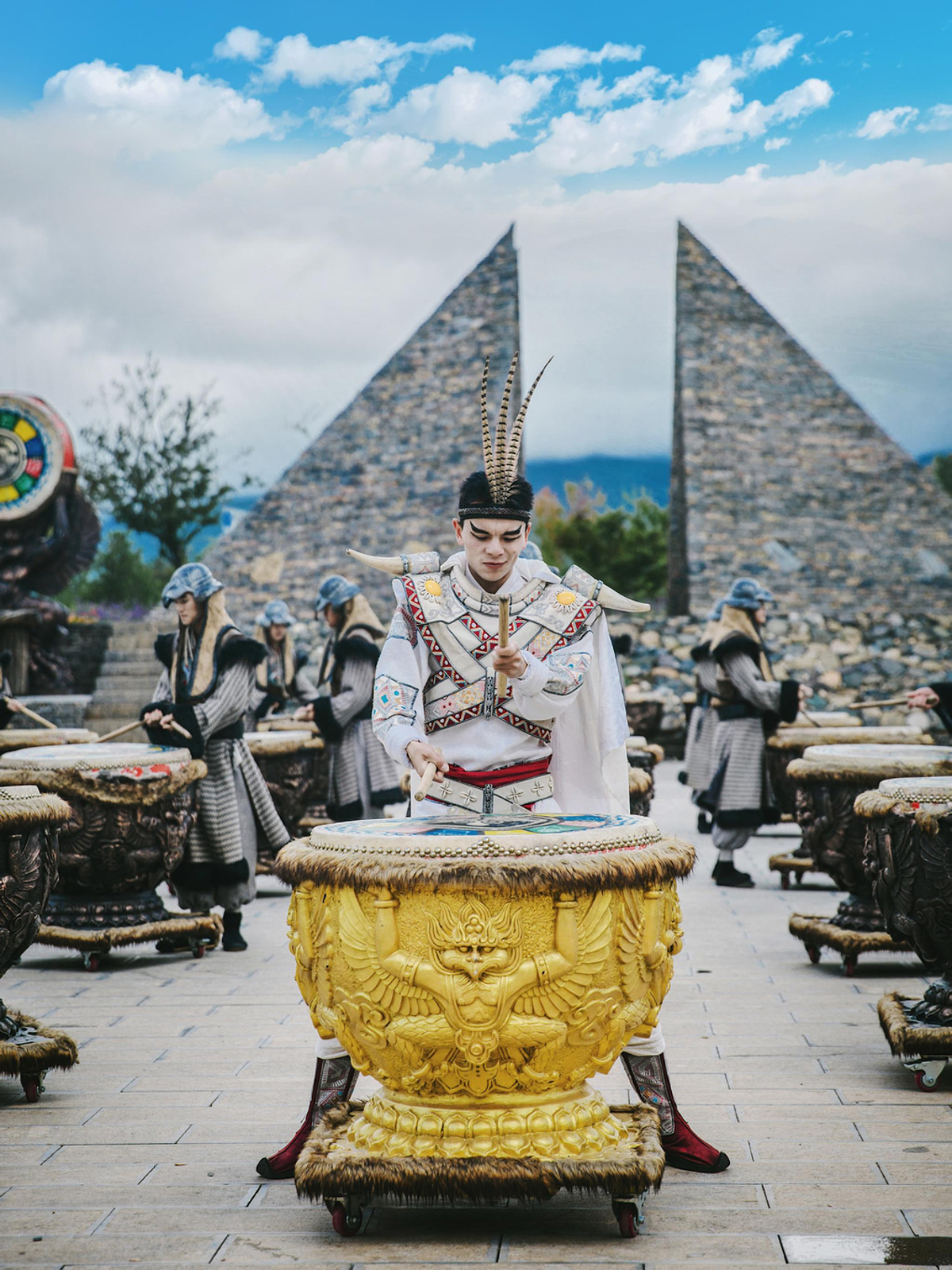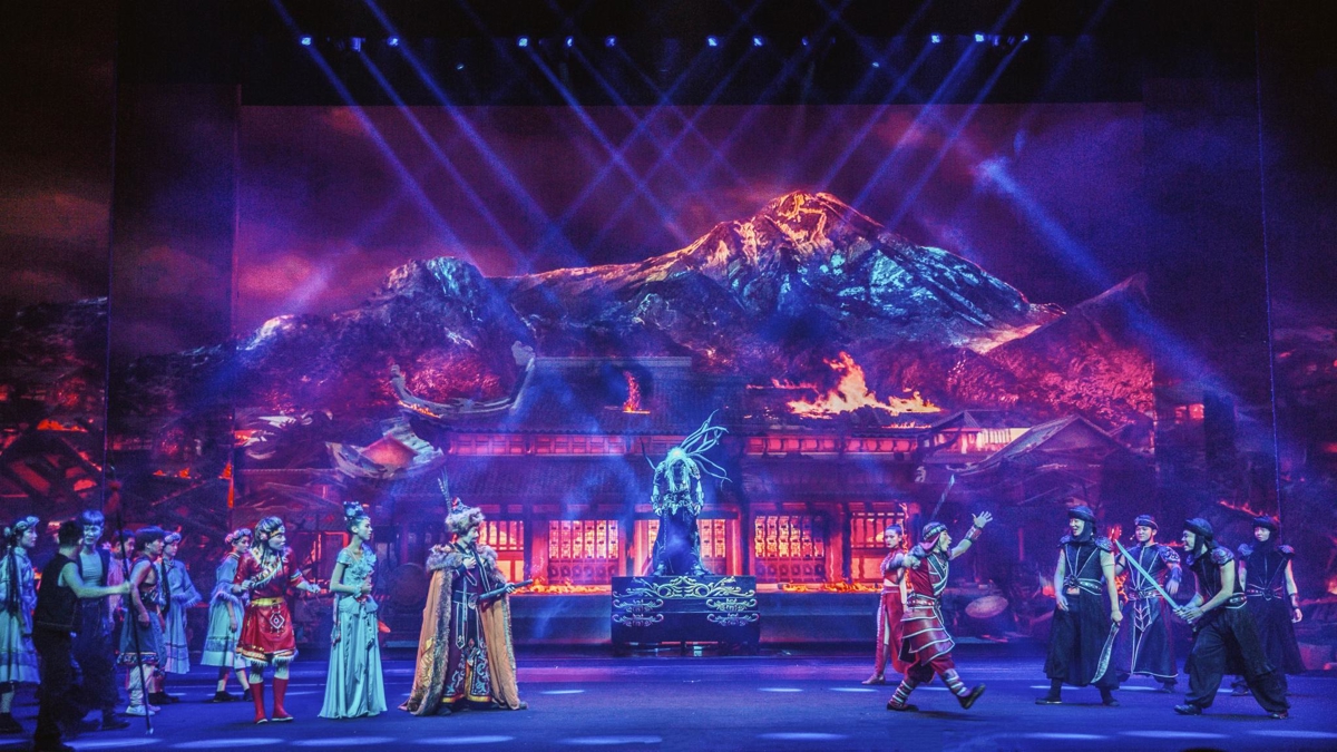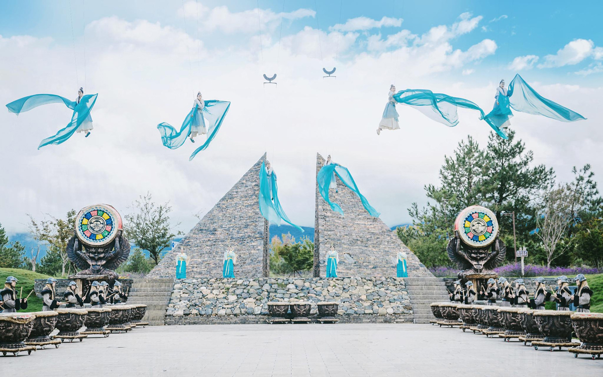 Right as we entered, an ethnic welcome show pulled us into a grand Lijiang folk celebration. Soldiers in traditional Mu Fu costumes beat drums to open the show, and within moments, blue-clothed fairy dancers descended from the sky in graceful dance. A 100-meter wire act, 30 meters high—where breathtaking spectacle and ethereal beauty combine on a stage straight out of paradise.