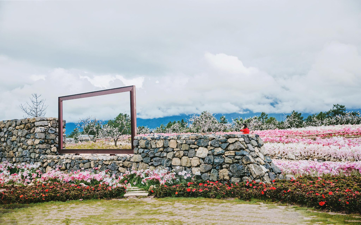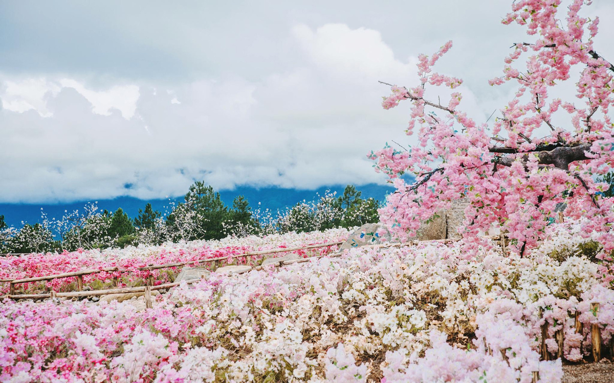 Continuing forward from the welcome show, we stumbled upon the trending flower sea. Beneath falling cherry blossoms, beside snow mountain forests—the blue-pink color combination looks especially elegant. Gesang flowers and cherry blossoms weave into a romantic, dreamy picture, like a real-life version of "Eternal Love" (Three Lives, Three Worlds, Ten Miles of Peach Blossoms).