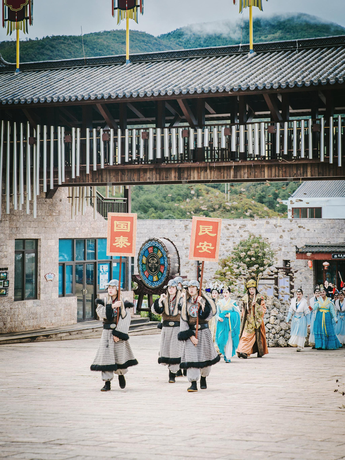 The long corridor nearby is densely hung with Dongba wish-making wind bells. On thin wooden plaques are wishes written by visitors themselves. When the gentle breeze blows, crisp bell sounds echo under the blue sky and white clouds. Before you've even finished touring the park, you've already experienced the romance of the Naxi people.