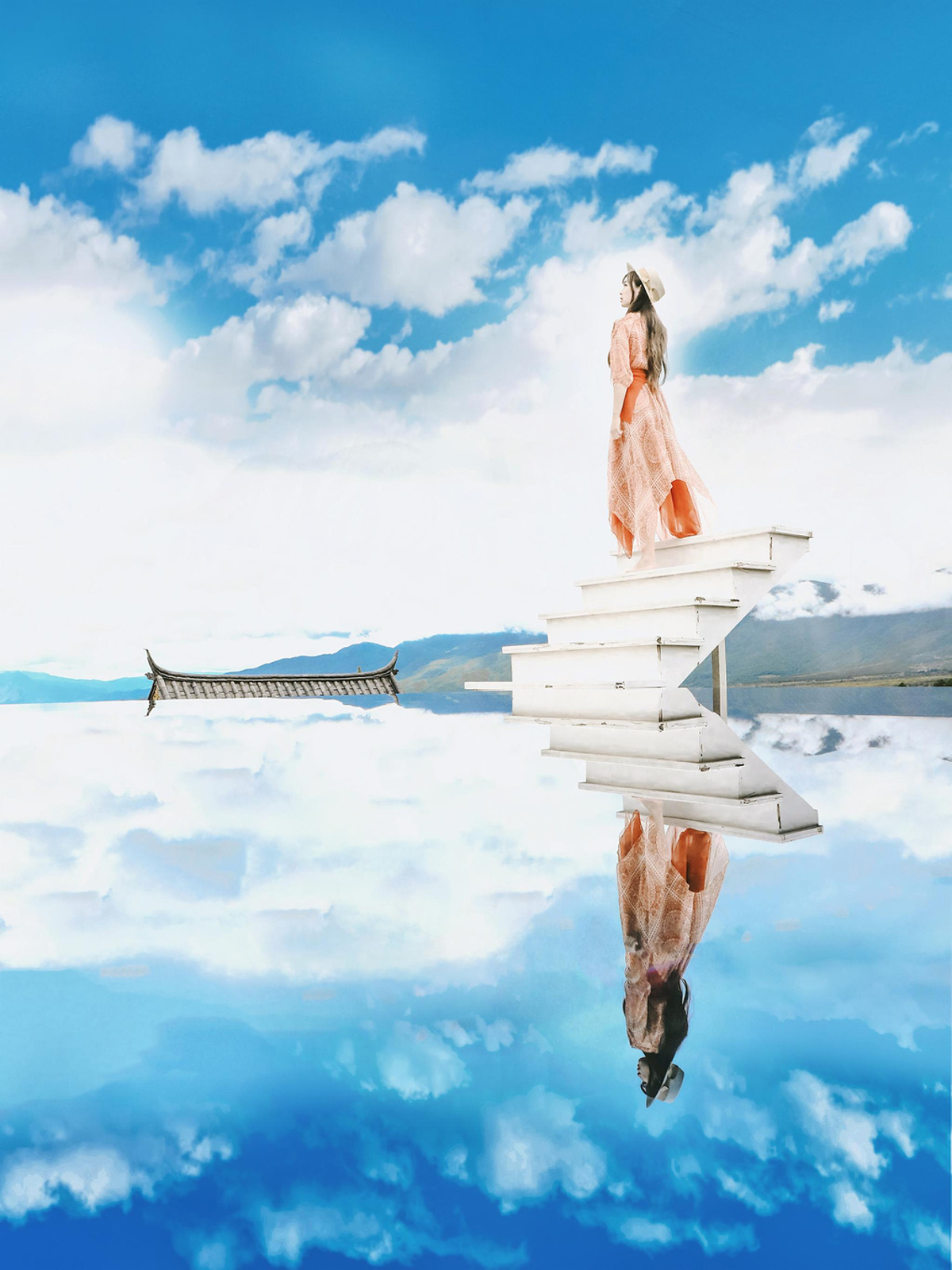 The sky mirror, reflecting distant mountains and clouds, seems to hang in the blue sky. Walking on it feels like strolling on clouds, moving suspended in air. The blue sky and white clouds beside you seem dreamlike, as if you could reach out and touch them—literally paradise.