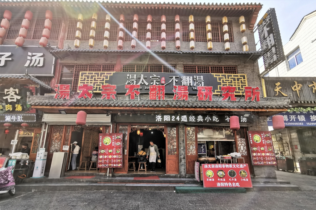 For lunch, we tried the famous "Fanfan Tang" (不翻汤 - "don't flip soup") and Luoyang potstickers (锅贴) at a popular spot on the old street.