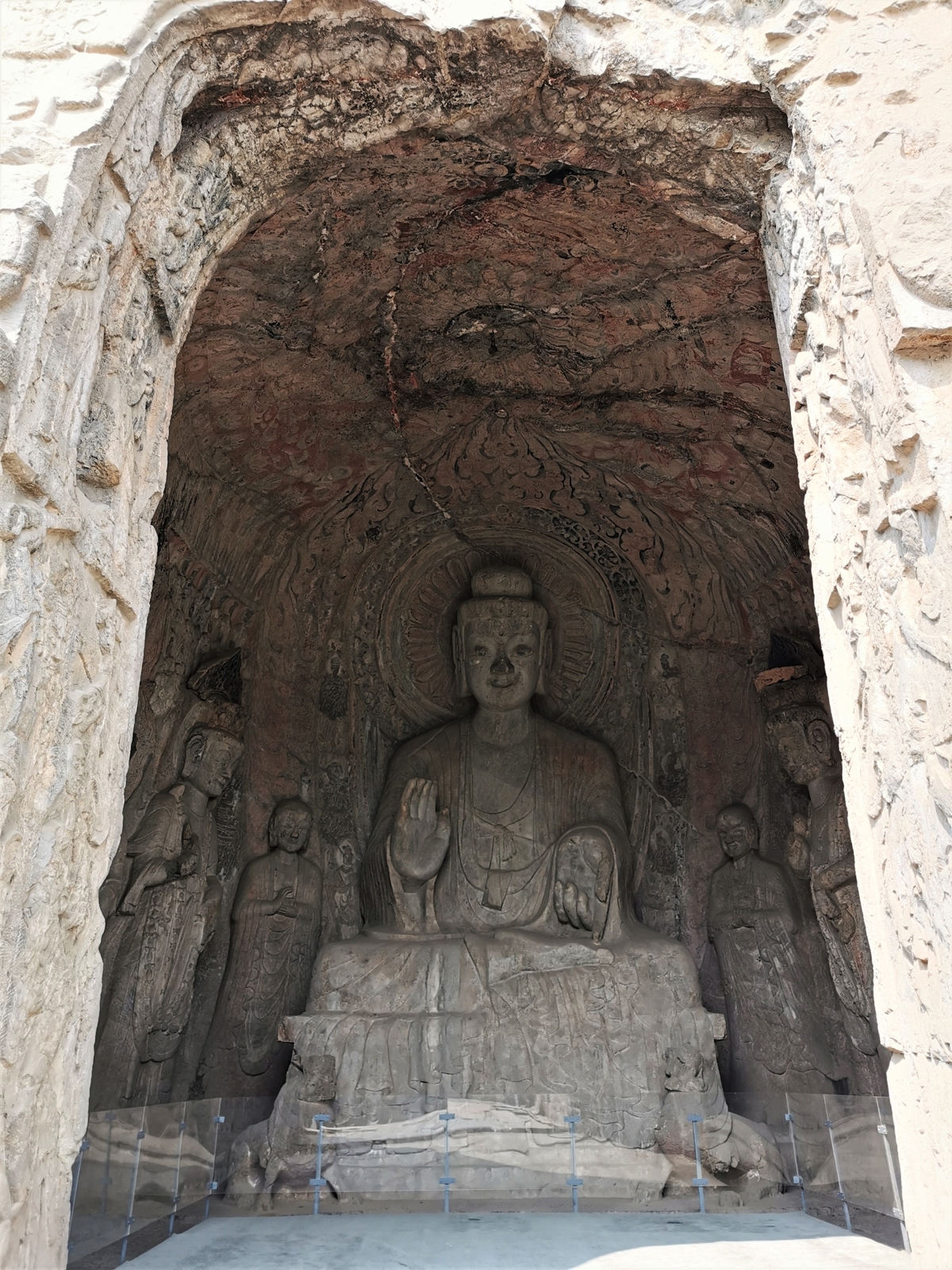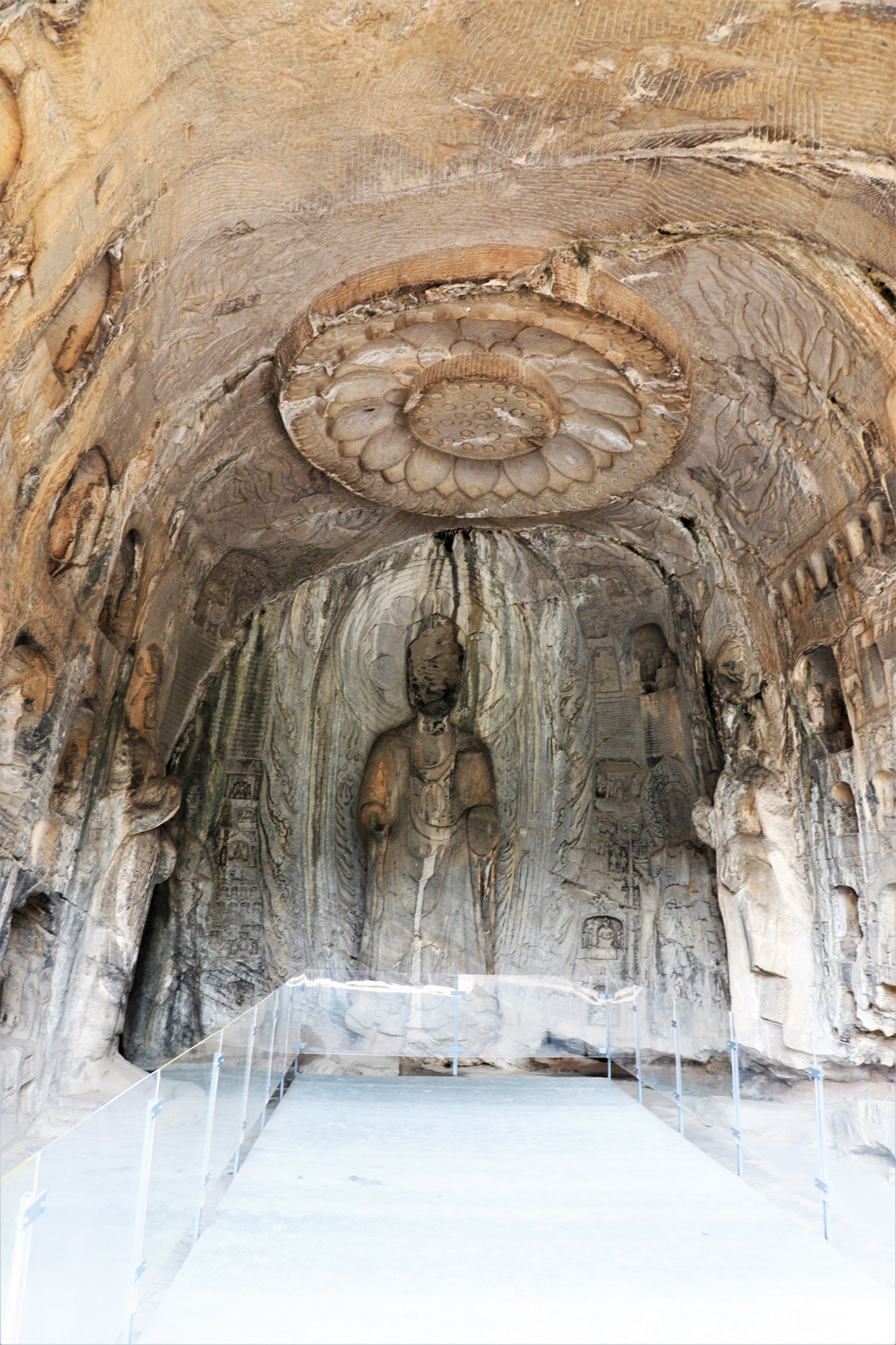 The Binyang Middle Cave (宾阳中洞), built during the Northern Wei period, features stunning high-relief lotus carvings on the ceiling.