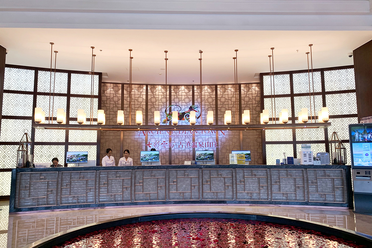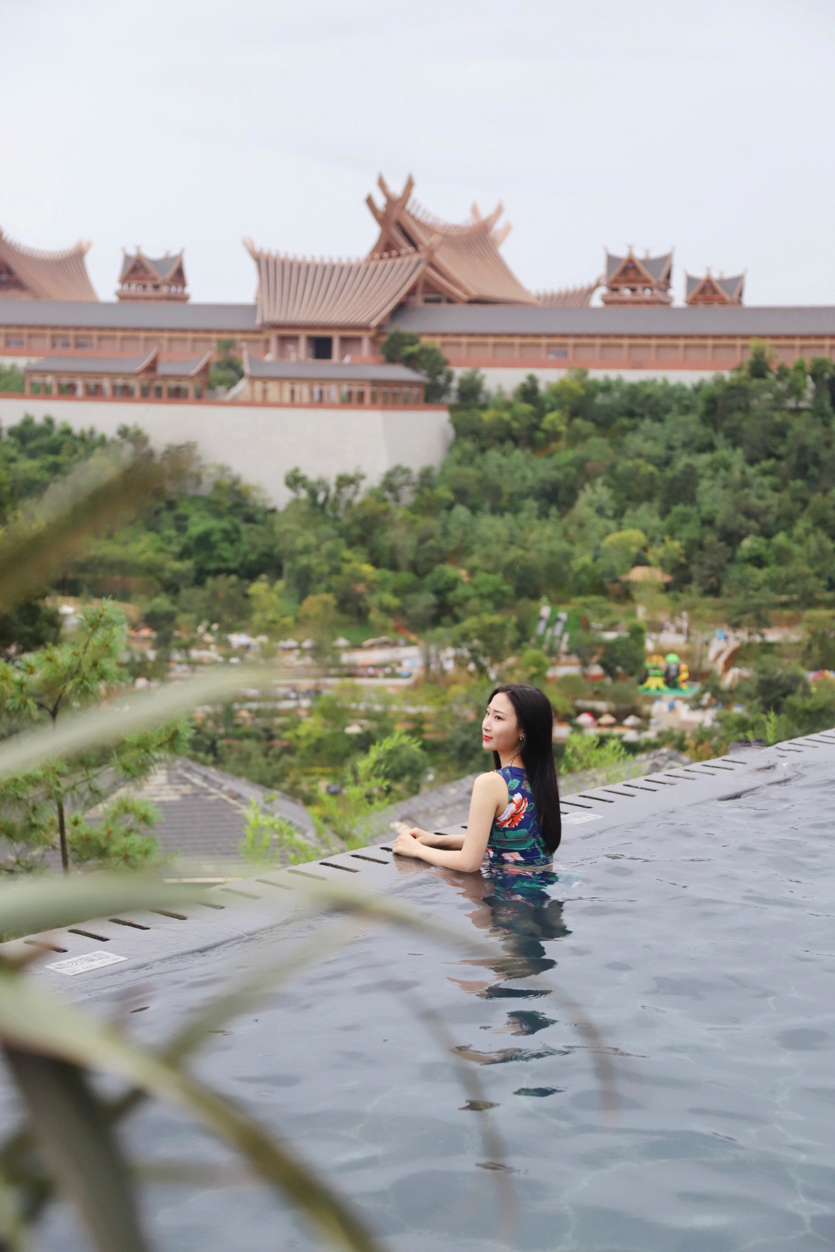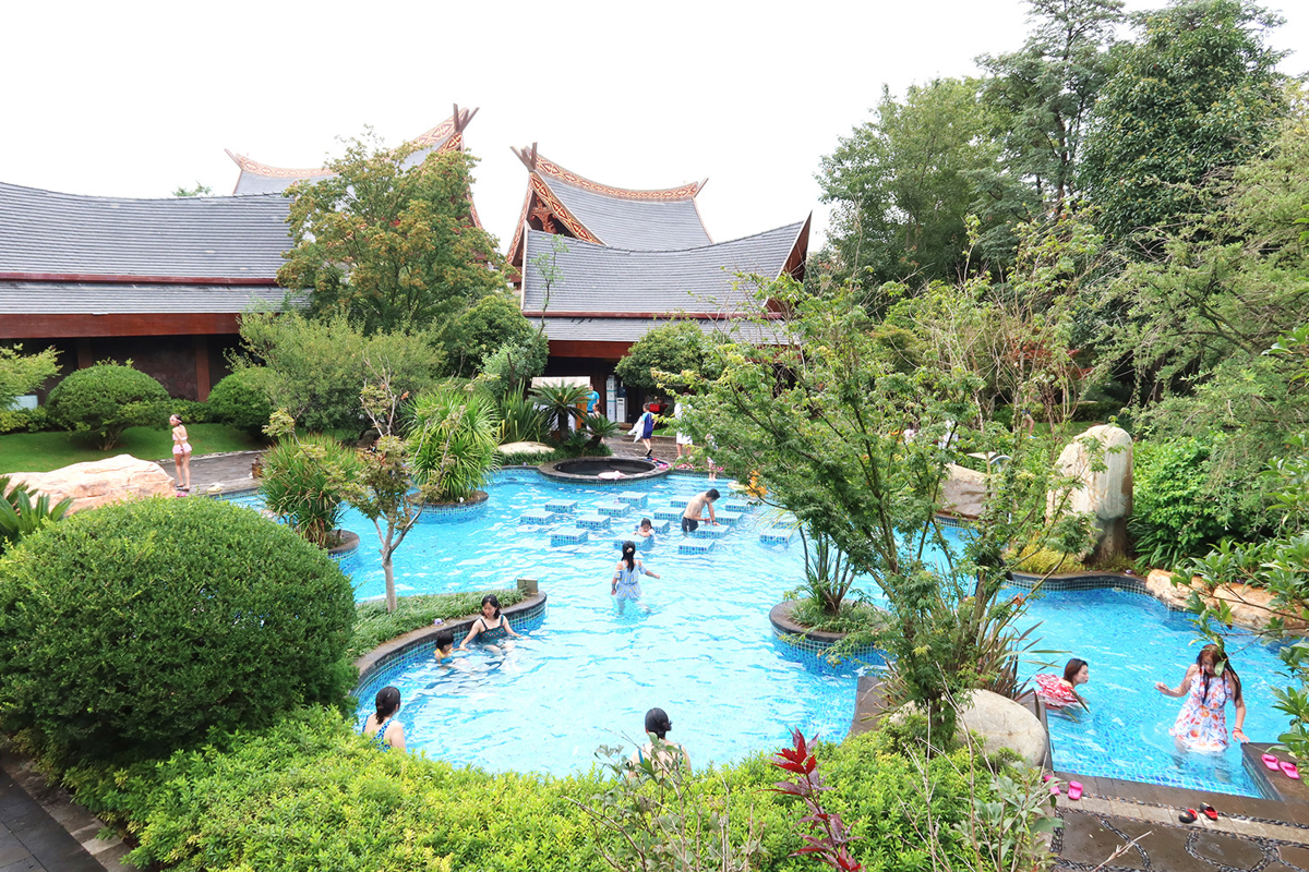 The hot spring area is divided into four zones with 72 forest pools and 36 private villa pools, each offering different therapeutic benefits. At the mountaintop, there's an infinity pool called Qiongtai Pool (琼台浴池) where you can soak while enjoying panoramic views of the Ancient Dian scenery.