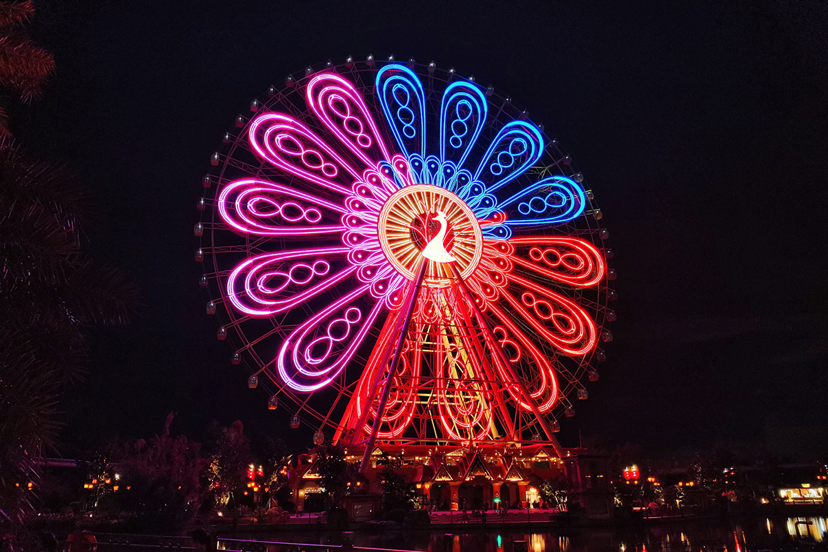The first thing that catches your eye upon entering is the "Eye of Dianchi" (滇池之眼)—a massive 108-meter-tall Ferris wheel decorated with peacock patterns. From the top, you can see the entire resort. My recommendation: start with the Ferris wheel to get your bearings, then plan which rides to hit.