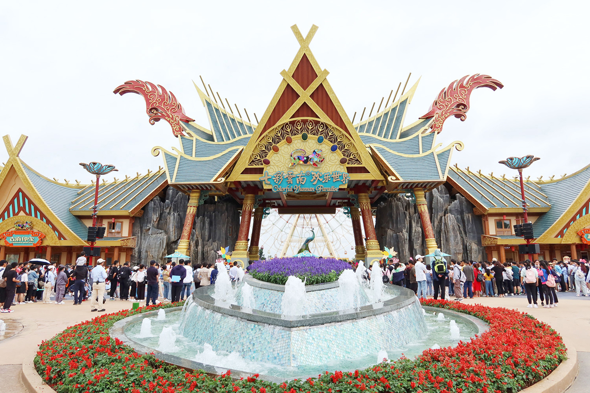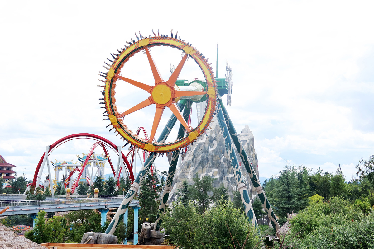 Other unique attractions include the Flying Cinema's "Fly Over Colorful Yunnan," the Tiger Leaping Gorge water ride, the Double Tower Space Shot, and the Primordial Stone Hammer—all themed around Yunnan's culture and landscapes.