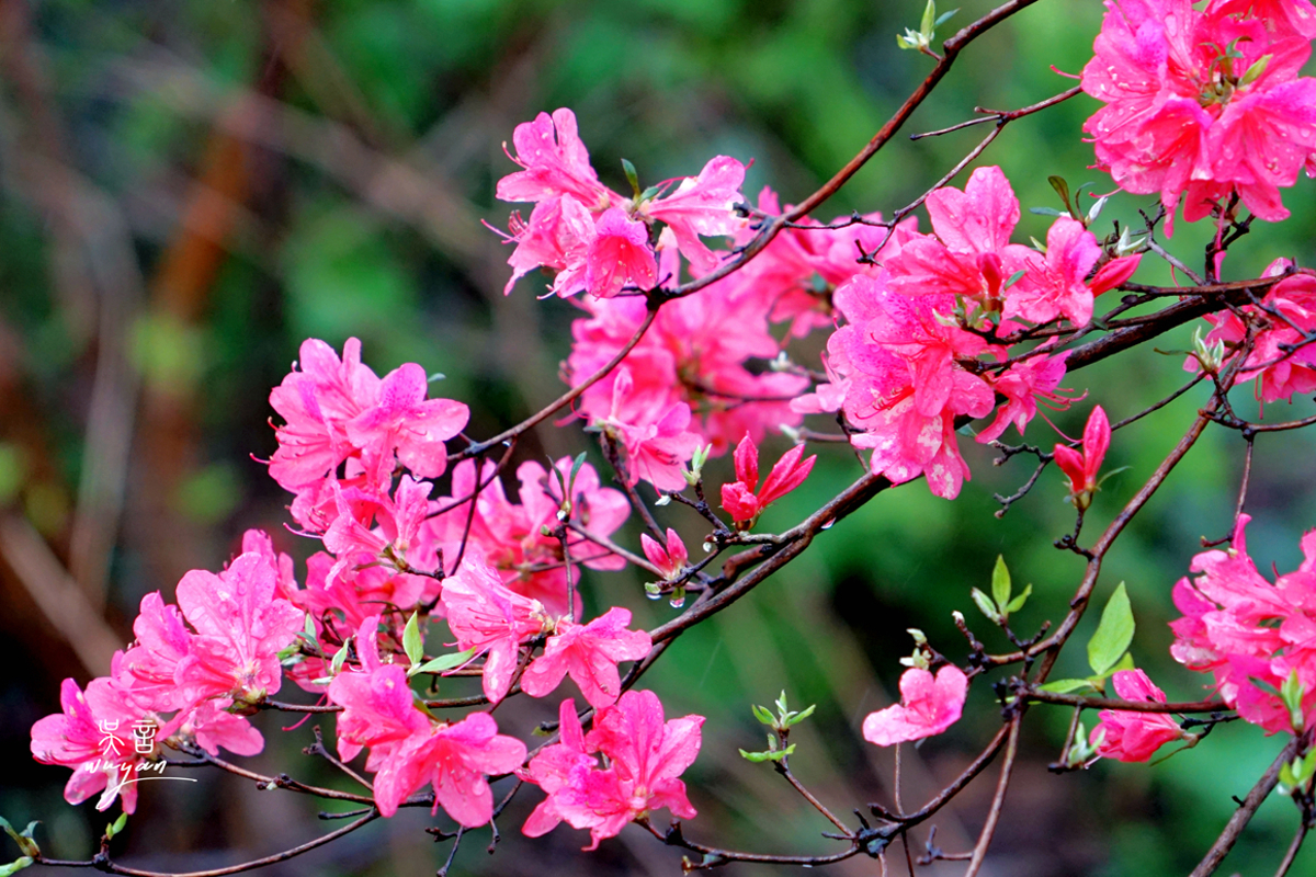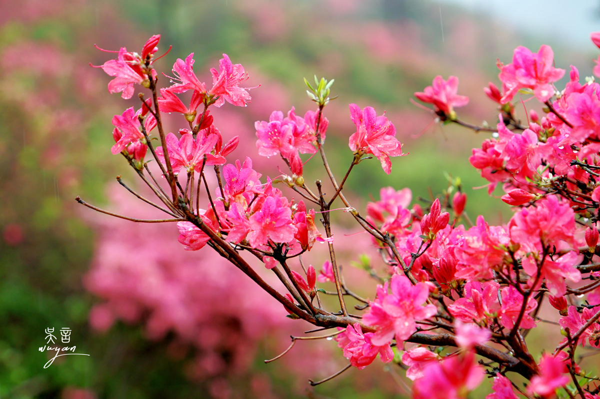 On the flower mountain, the fine rain continued. The mountain's azaleas, to welcome us travelers from afar, began their bathing ritual in the middle of the night. Their wet hair still drips with water droplets—like fairies who just finished playing in the mountain's clear pools, shaking water from their hair and smiling as they walked toward us.