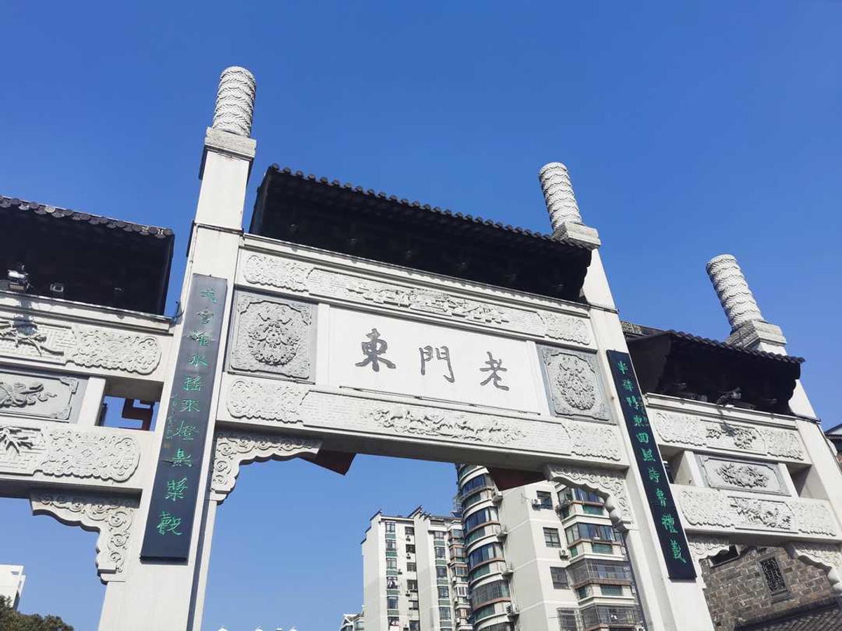 Next stop: Laomen East (老门东). At the entrance of Gytong Alley (箍桶巷), a grand stone archway stands before me with "Laomen East" (老门东) inscribed on it.