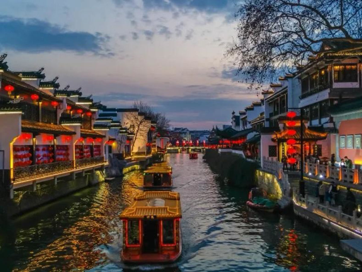 The Confucius Temple area at night—boats gliding on the Qinhuai River, lanterns reflecting on the water, the famous "Six Dynasties" atmosphere.