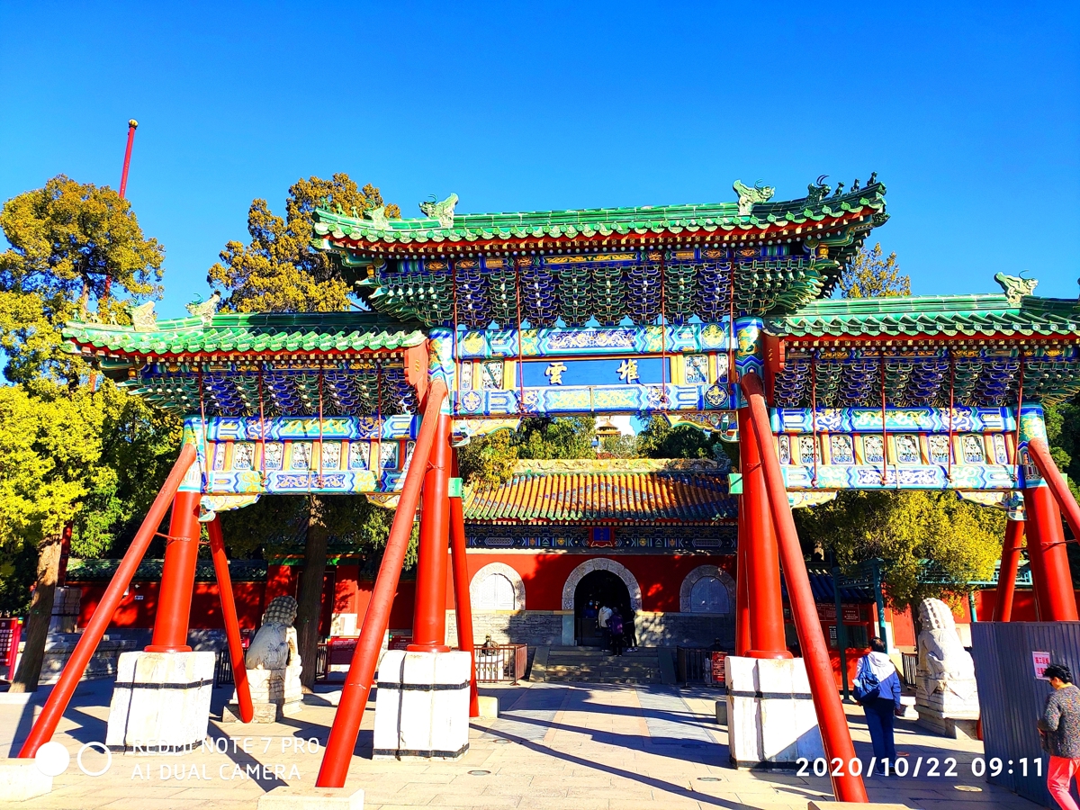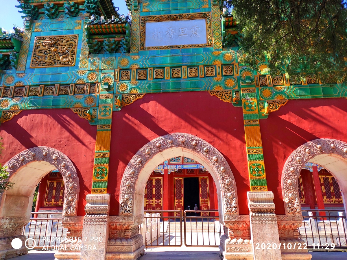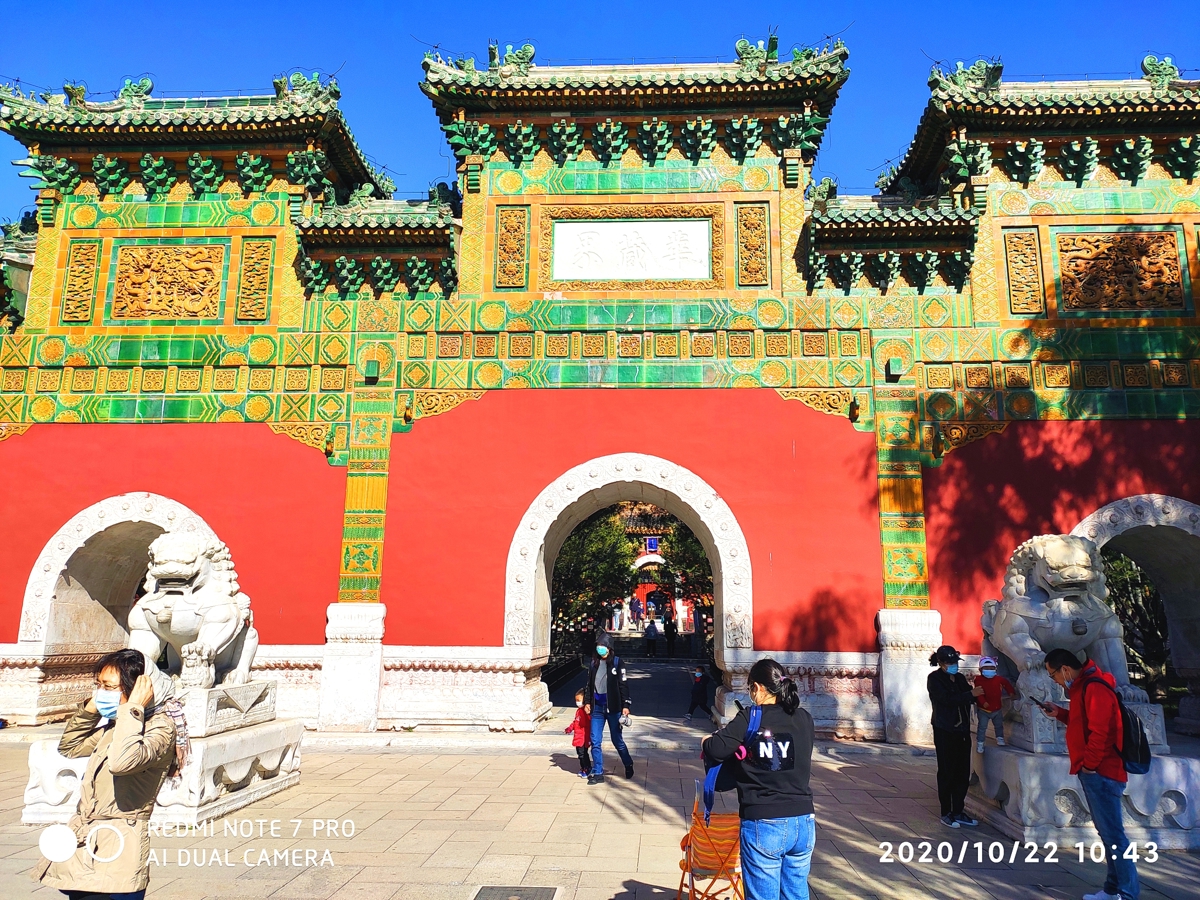 Originally the Western Buddhist Temple (西天禅林) from the Ming Dynasty, the front of this complex features a four-pillar, seven-story glass archway with inscriptions by Emperor Qianlong—"华藏界" (Huázàng Jiè - Realm of Buddhist Treasure) on the front and "须弥春" (Xūmí Chūn - Spring of Sumeru) on the back.