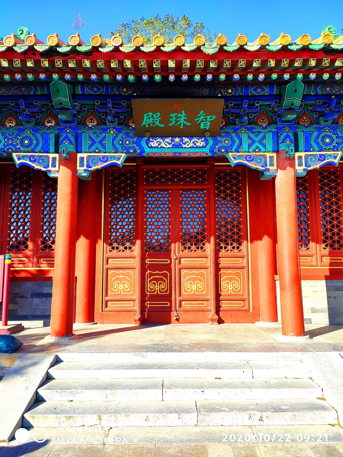 At the eastern foot of Qiongdao Island sits Zhuzhu Dian (智珠殿, Zhìzhū Diàn)—the Temple of Wisdom Pearl—built in 1751 during Qianlong Emperor's reign. This impressive structure features red walls, green tiles, and five ornate gatehouses arranged symmetrically, a rare architectural design in Chinese gardening.