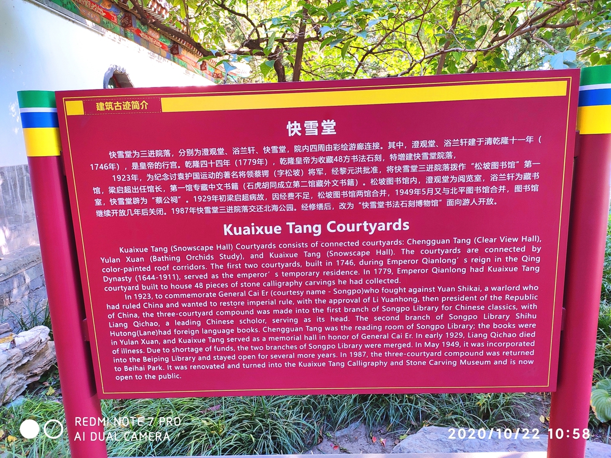 Built in 1775 during Qianlong's reign, the Kuixue Tang (快雪堂, Fast Snow Hall) houses famous calligraphy from the Jin through Yuan dynasties. The most celebrated piece is Wang Xizhi's "Kuai Xue Shi Qing Tie" (Quick Response to Clear Weather) alongside Qianlong's own "Kuixue Tang Ji" (Record of Fast Snow Hall).
