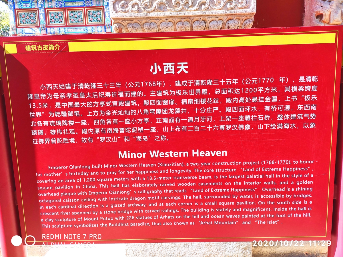Little Western Heaven (小西天, Xiǎo Xītiān) was built between 1768-1770 by Emperor Qianlong to celebrate his mother's 80th birthday. The main structure, the Ultimate Bliss World (极乐世界, Jílè Shìjiè), covers 1,200 square meters with a 13.5-meter beam span—China's largest square pavilion-style palace.