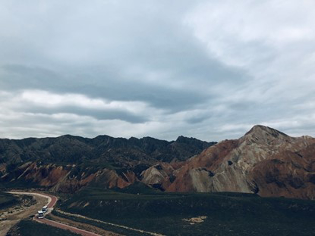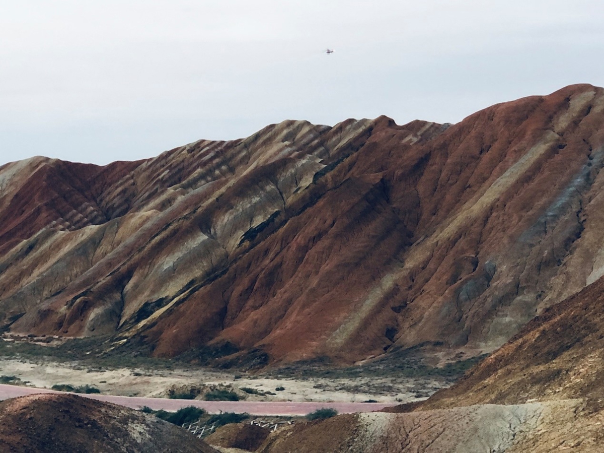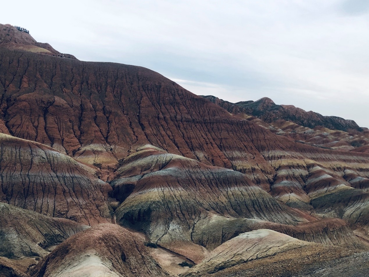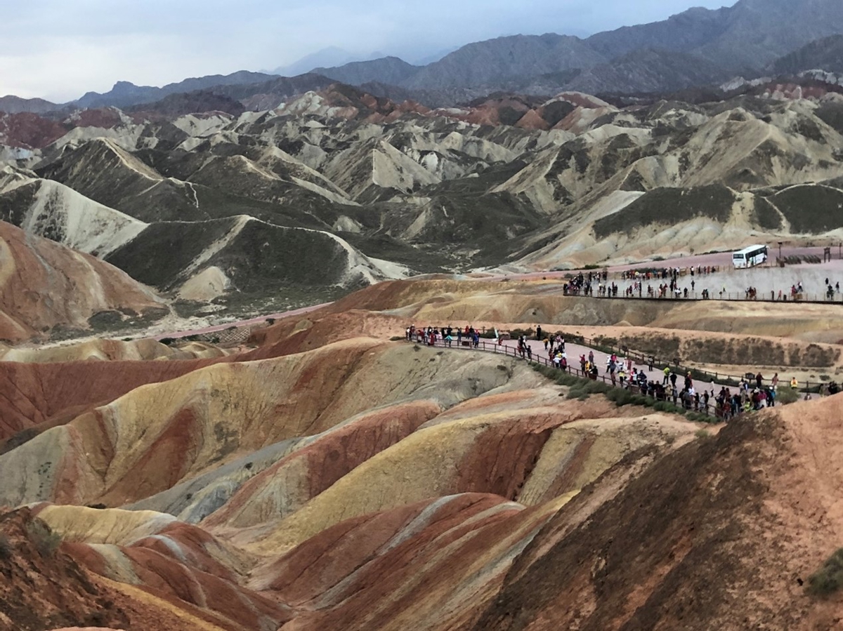 Reached Colorful Danxia (七彩丹霞) in overcast weather - the only gray day of our trip. The colors were still visible though less vibrant. This place is incredibly popular - every viewpoint was packed.